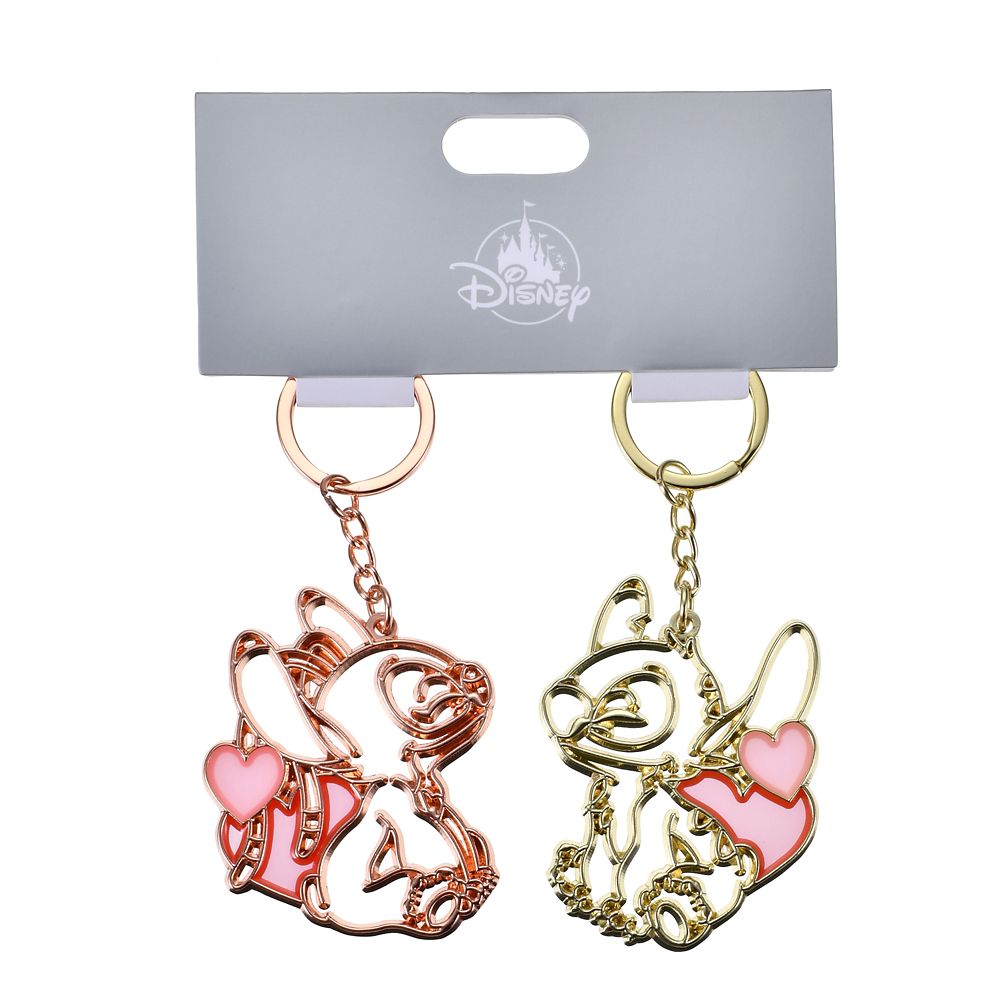 メタリックなラインデザインがおしゃれ。スティッチ&エンジェルのペアキーチェーン。