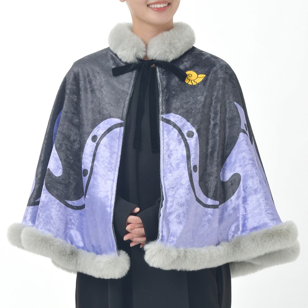 立体的な存在感のあるフェイクファーの縁取りが華やかさをプラス。胸元の刺しゅうは、アースラが身に着けているネックレスの貝デザインです。