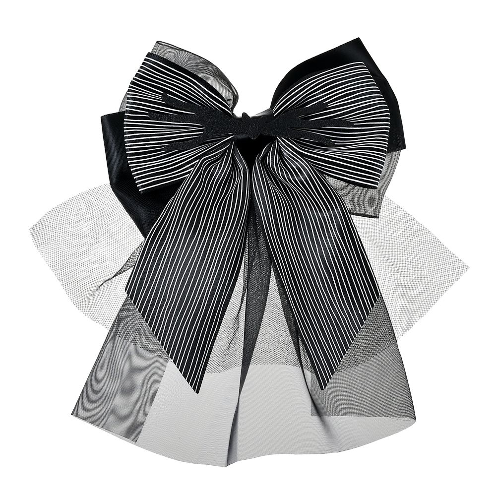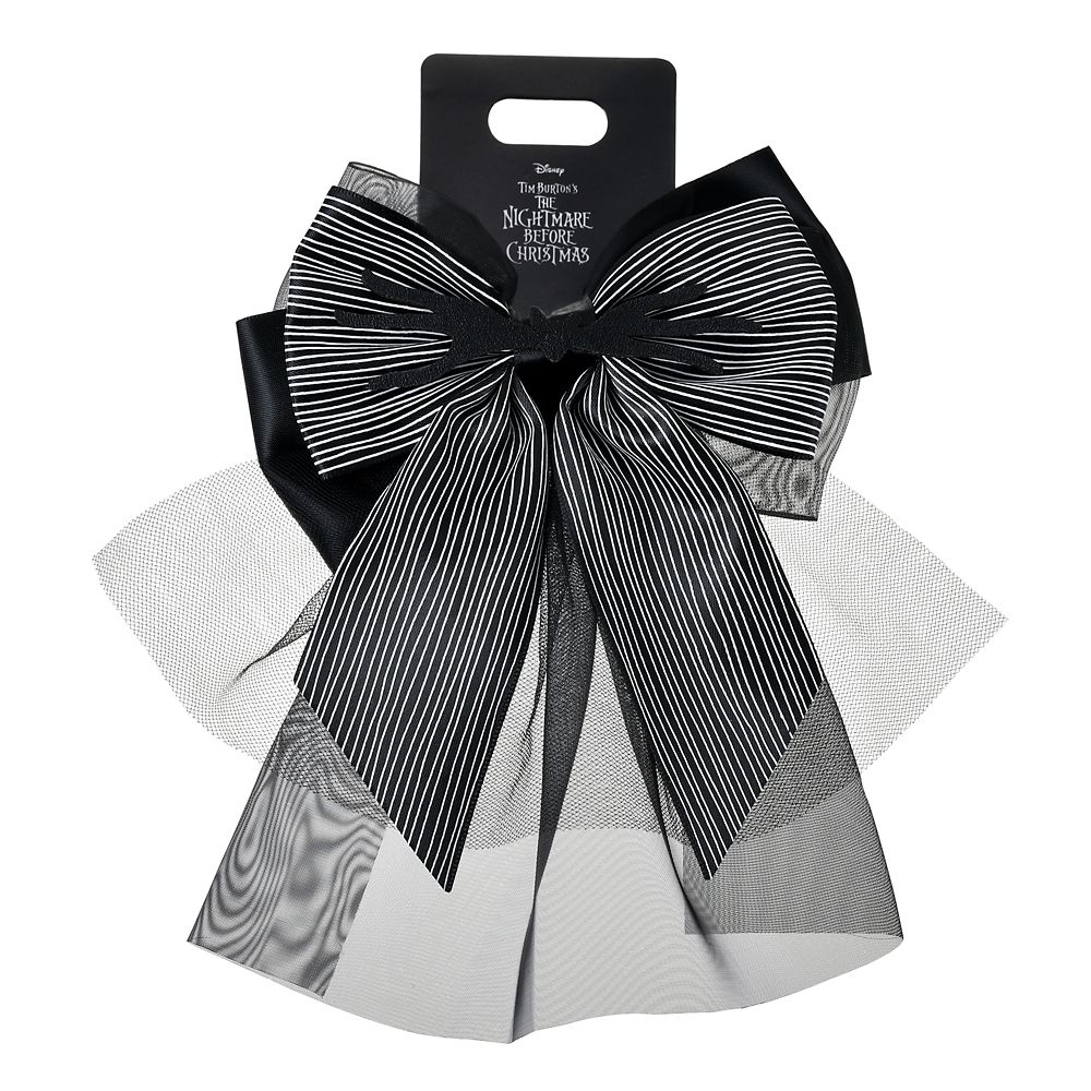 ジャック・スケリントンが身に着けている蝶ネクタイを表現したレザー調素材のコウモリモチーフの下に、キャラクターが着ているコスチュームと同じストライプ柄リボン、黒色のサテンリボン、シアー素材のリボンを重ねた、華やかなデザインです。
