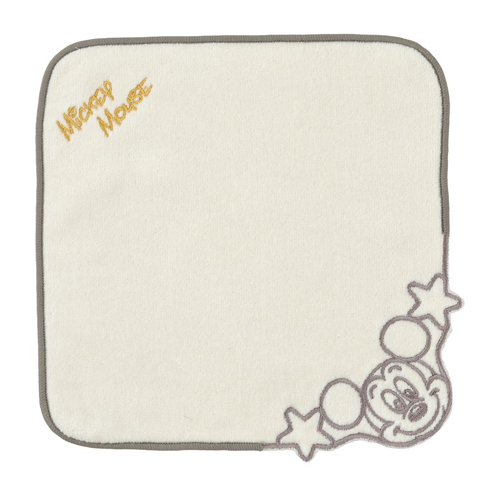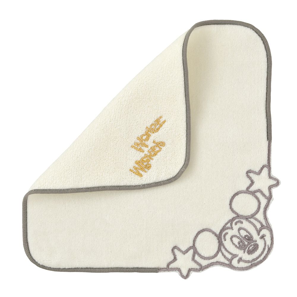 ふんわりとした白色のタオルにキャラクターとネームロゴを刺しゅう。キャラクター部分のカッティングがおしゃれなデザインです。