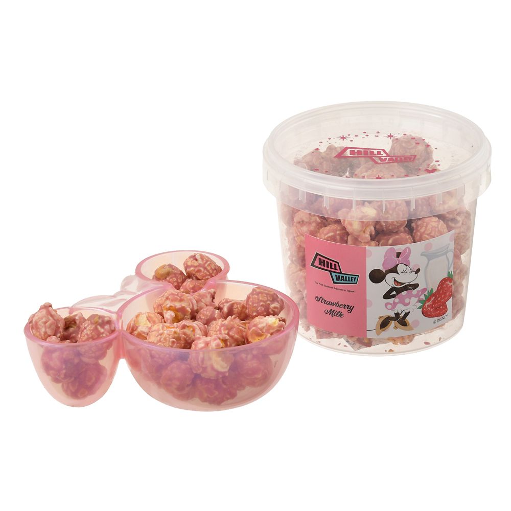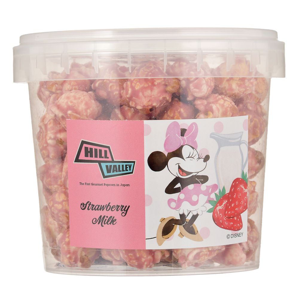 グルメポップコーン専門店「HillValley(ヒルバレー)」のポップコーンに、ミニーデザインのクリアバーレル入りが登場。バニラ香る甘めのいちごフレーバー、ディズニーストアオリジナルのストロベリーミルク。