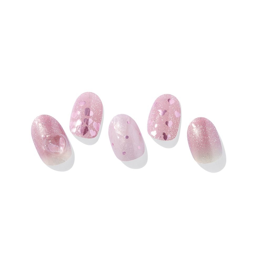 ほのかに輝くピンクオーロラグリッターの上に、アイコンとハートモチーフがきらめくロマンティックなデザイン。