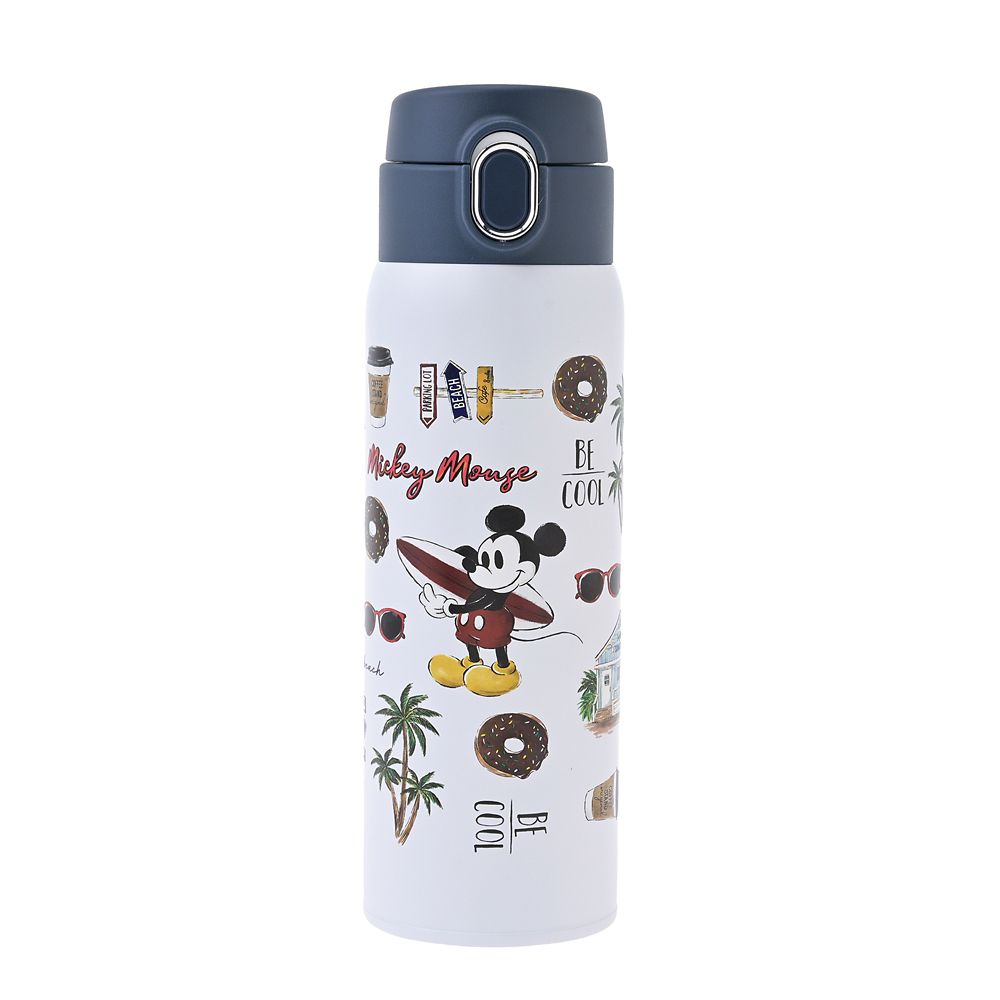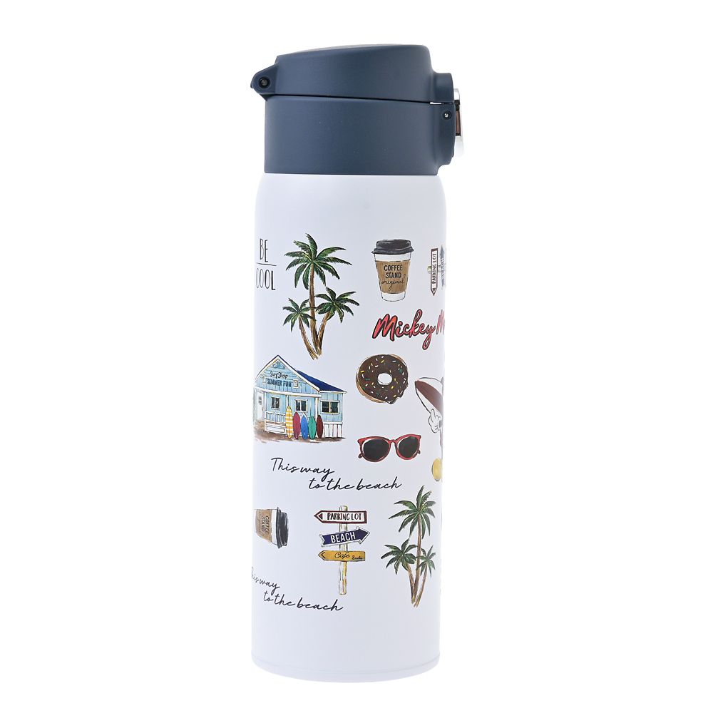サーフボードを持ったミッキー、ヤシの木やサングラスのイラストが楽しいデザイン。