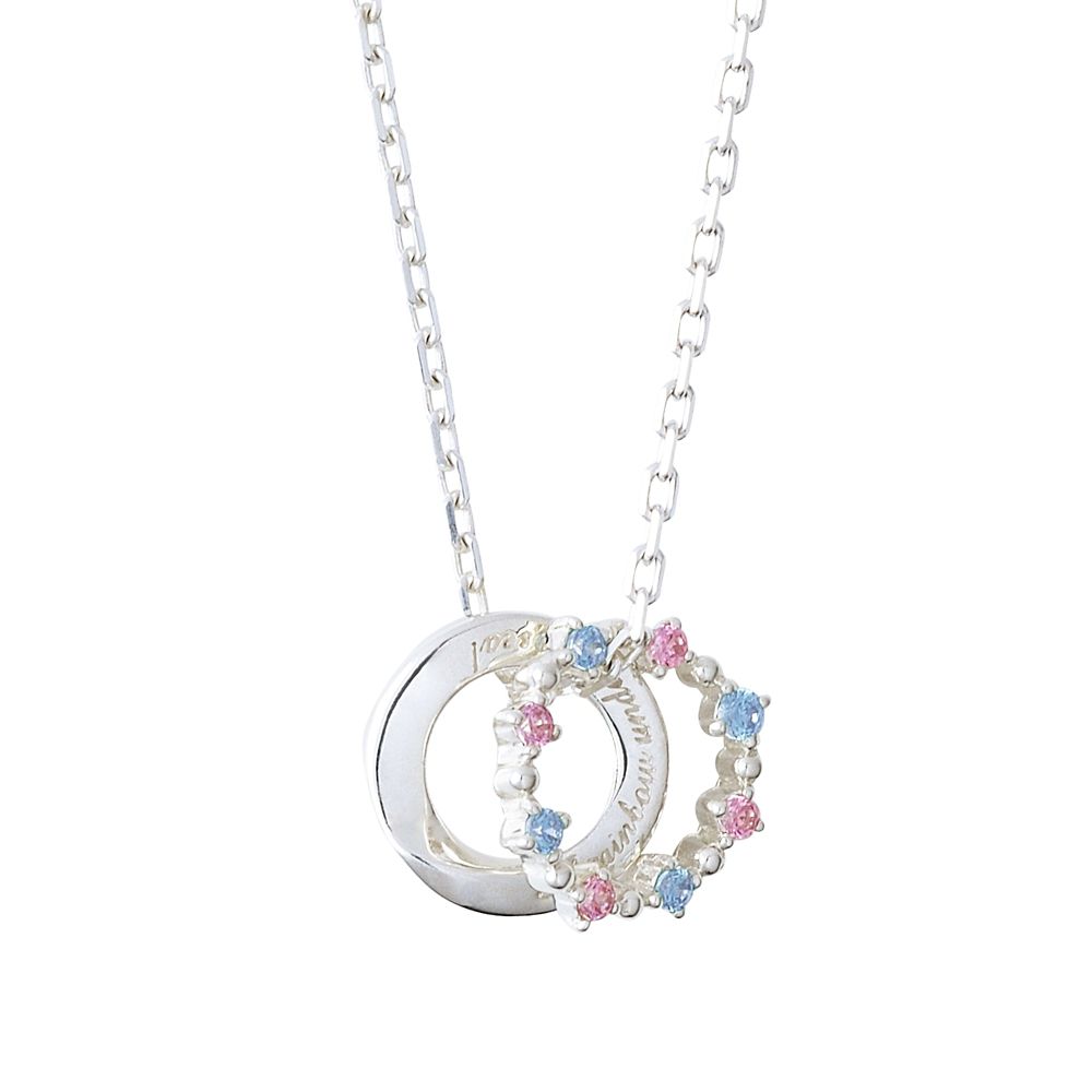 2つのリングパーツがキュートにゆれるネックレスです。波を表すゆるやかなラインのパーツと、アリエルをイメージしたカラーストーンが贅沢に並んだパーツを組み合わせました。動くたびにきらめき、胸元を華やかに演出してくれます。
