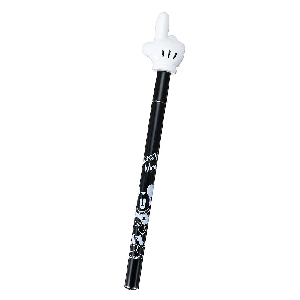 先端にキャラクターハンドのマスコットが付いたボールペン。マスコットあたりをグーンと伸ばすと指示棒になり、クルクル回すとペンキャップが外れてボールペンになります。インク色は定番の黒。