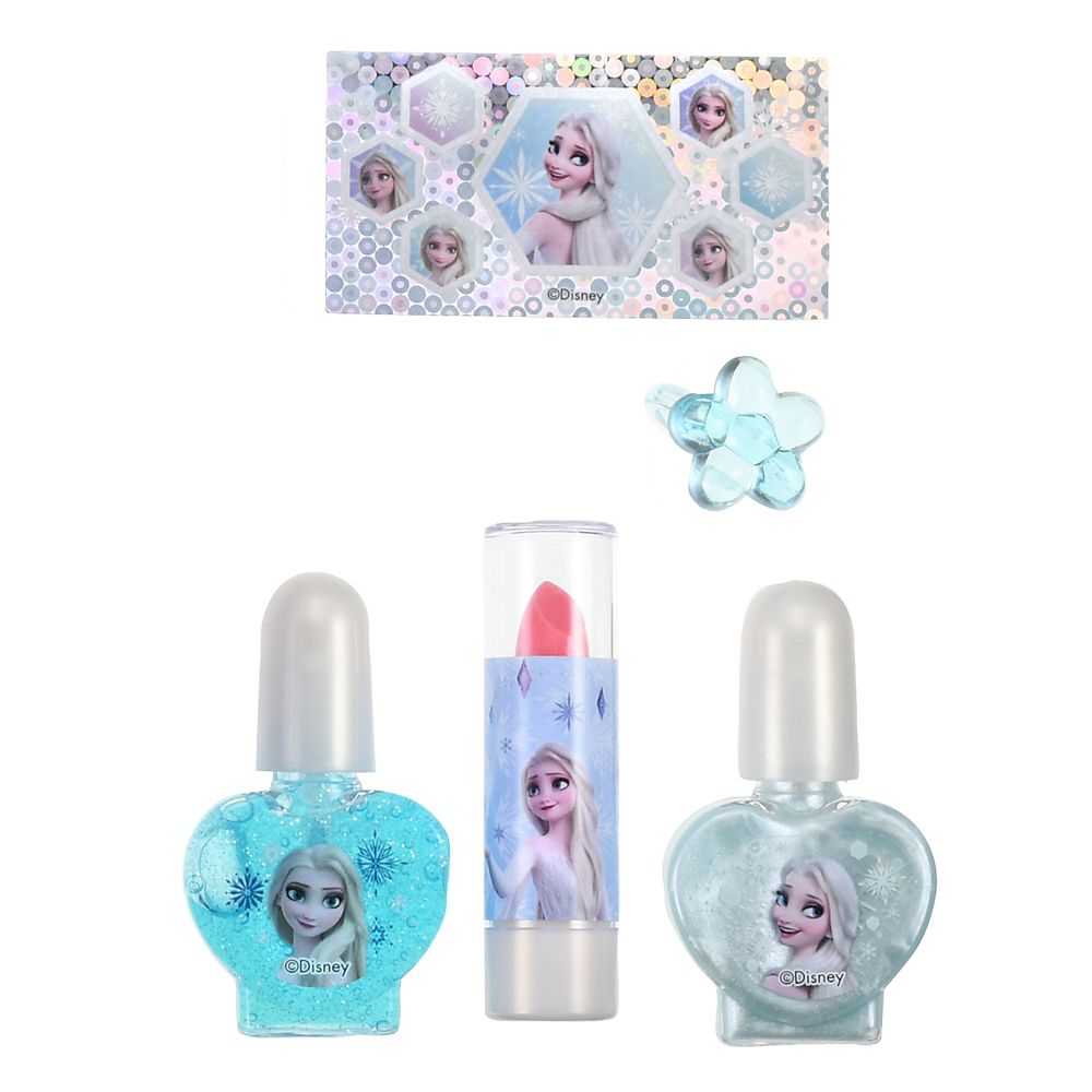 パール風ビーズハンドルがおしゃれなハンドバッグ型ケース。中には心ときめくアイテムがいっぱい入っています!エルサデザインのマニキュアと、ピンク色のリップスティックにはキラキラのラメやパール入り。マニキュアは水溶性なので、除光液を使わずに水やぬるま湯で簡単に落とすことができます。お花型リングとキラキラのシールも揃う、楽しいセット。