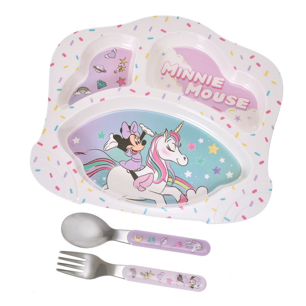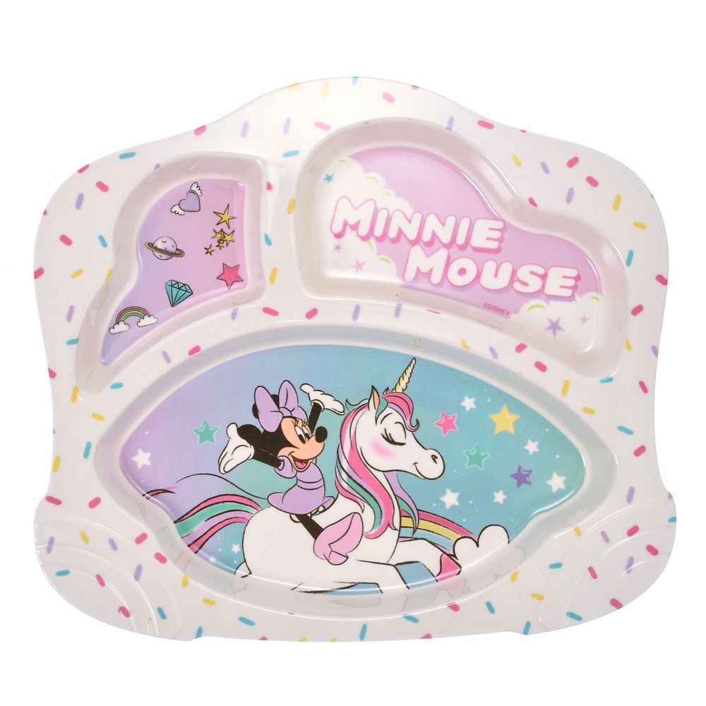 ユニコーンに乗ったミニーをプリントした夢っぽいデザイン。レストランや食堂のお子様プレートのような可愛い盛り付けがおうちでできる、仕切りつきのプレートです。親子で盛り付けを楽しむのもgood!軽量で割れにくく、お手入れが簡単なのも嬉しいポイントです。
