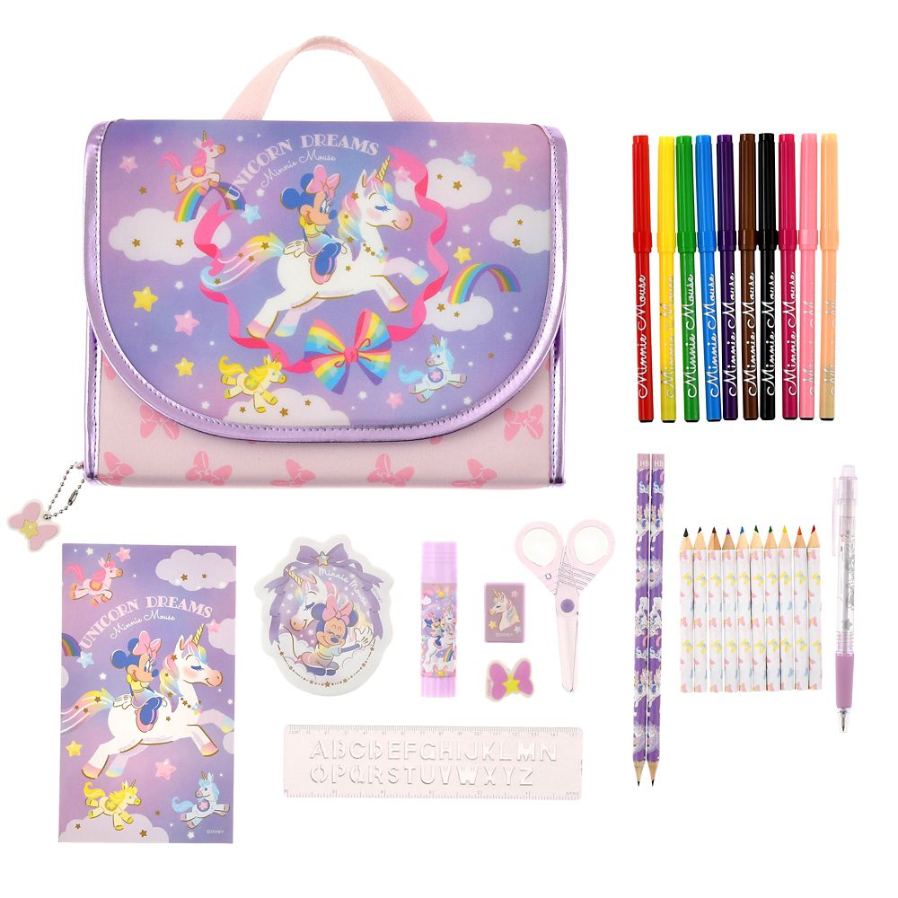 ミニーとユニコーンが描かれたハンドバッグ風ケース。中には、らくがき帳・カラーペン・色えんぴつ・えんぴつなどが入っています。ペンやえんぴつも1本1本イラストやロゴデザインなのが嬉しいポイントです。