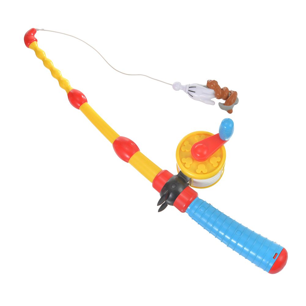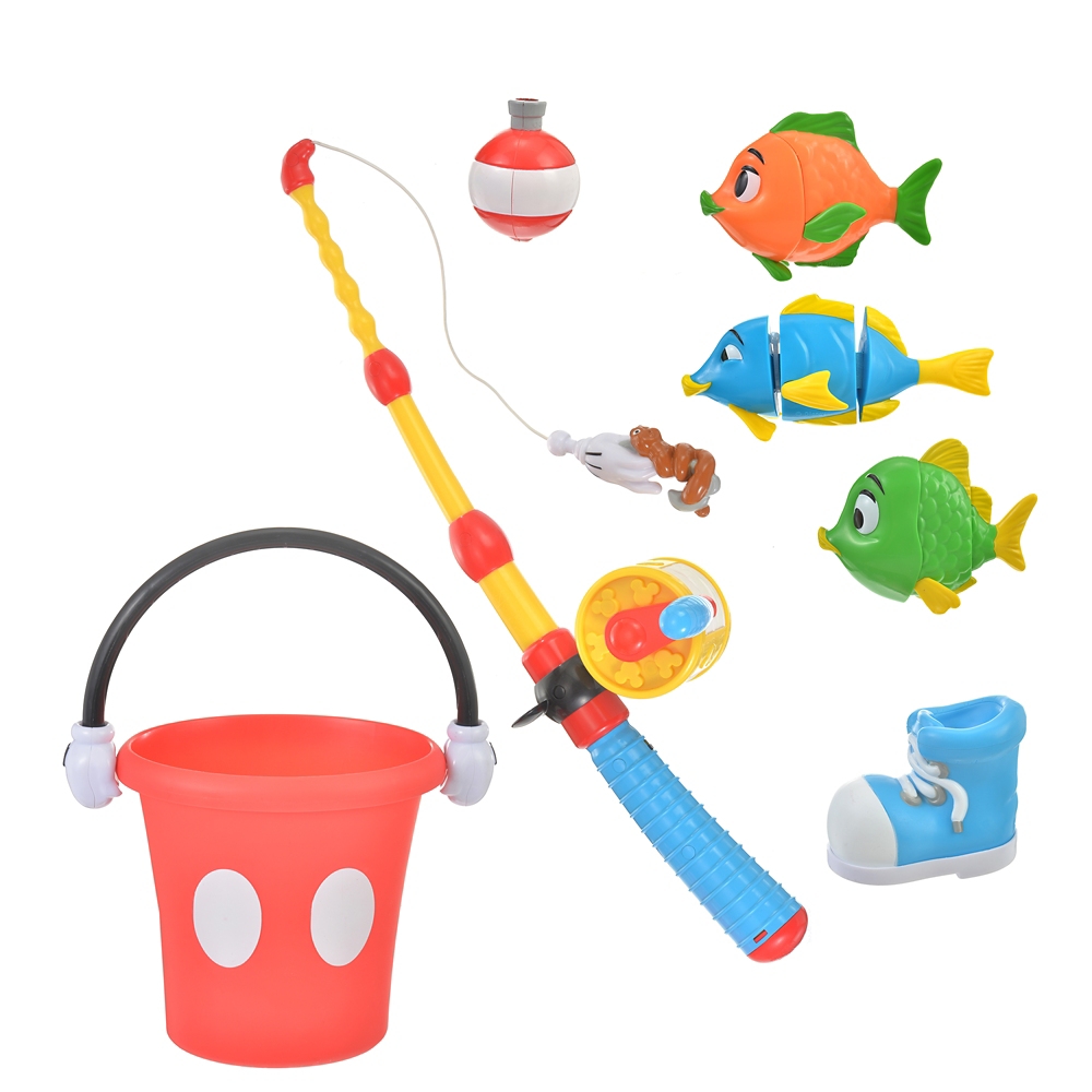 お部屋で遊べる魚釣りセット。釣り糸に浮きを付けて垂らすと、磁石でピトッ!カラフルな魚やブーツが釣れます。リールを回すと音が鳴ったり、魚が釣れると釣り竿がブルブル震えて臨場感たっぷり。ミッキーパンツデザインのバケツ付きです。