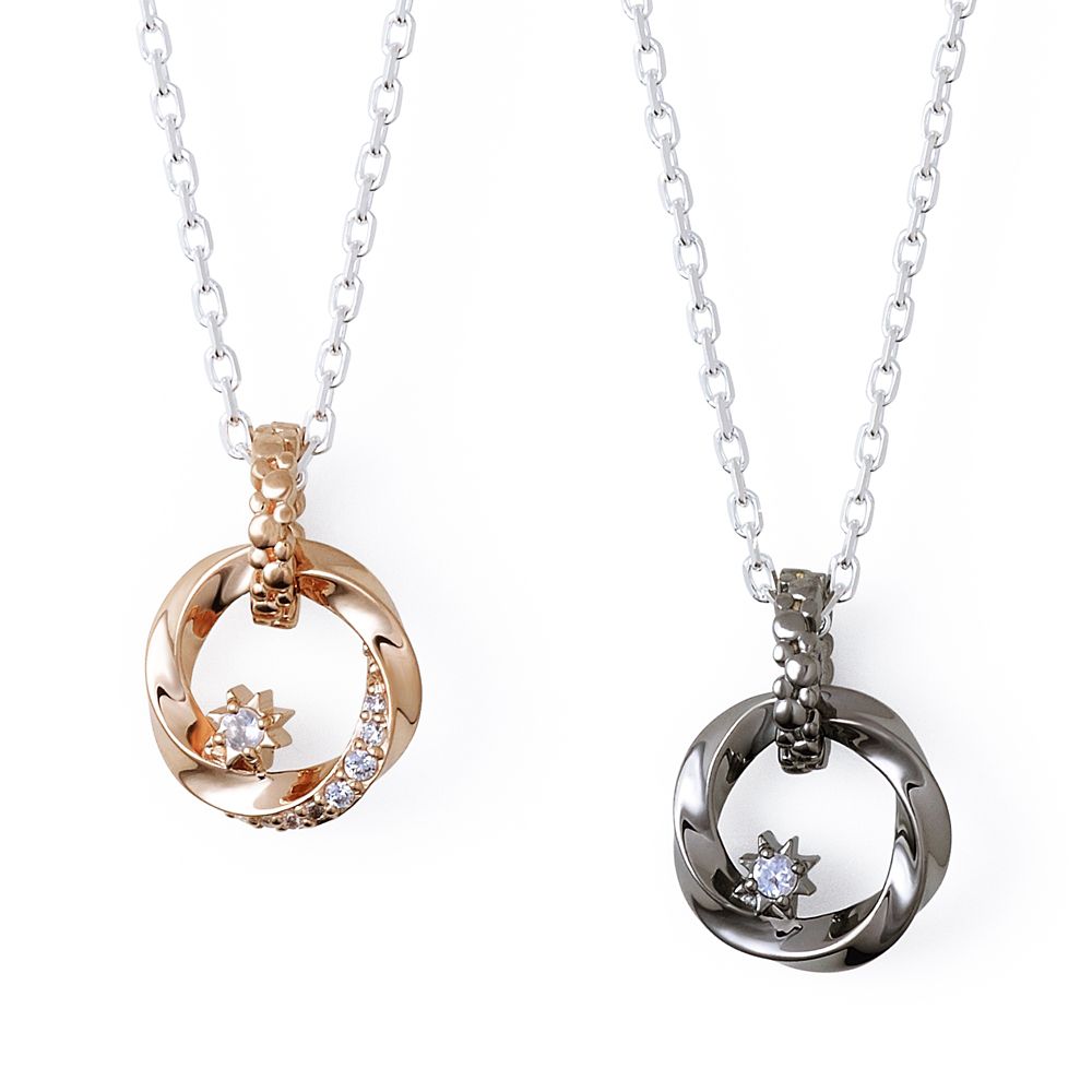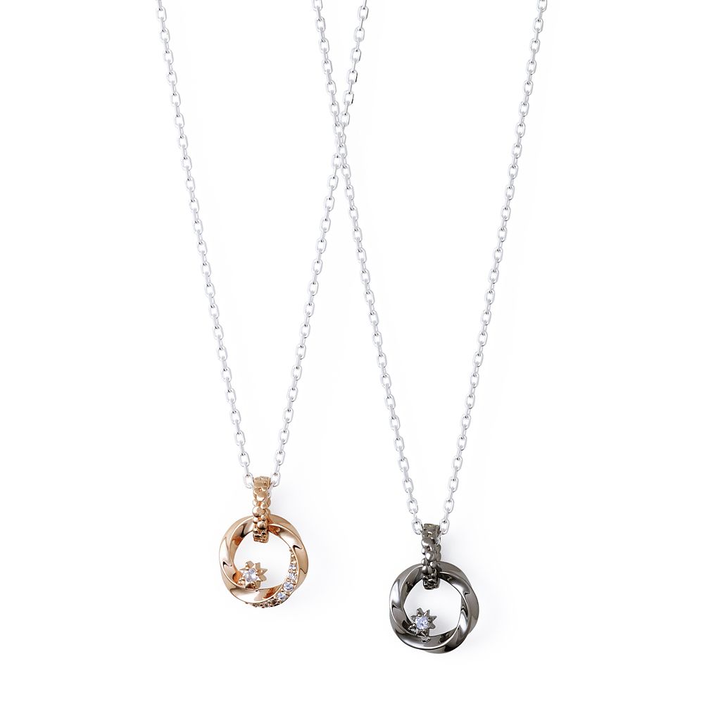 なめらかなツイストが美しい、サークルモチーフのペアネックレス。