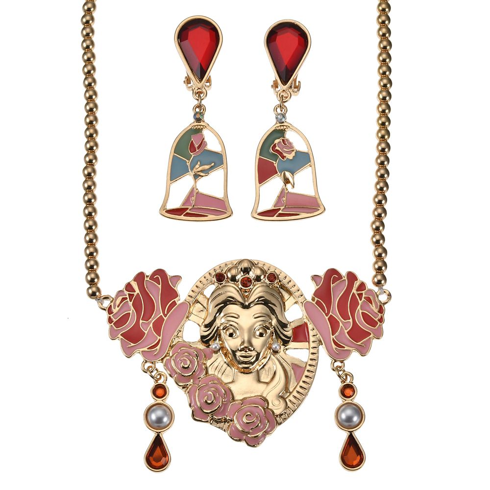 キャラクターフェイスをあしらったボリューミーなネックレスと、ストーンの下で魔法のバラが揺れるイヤリングのセットです♪