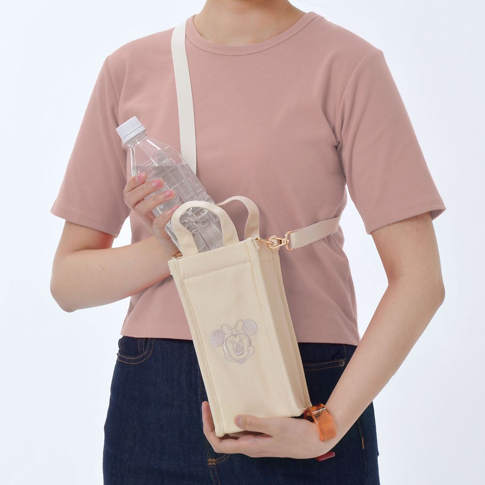 手持ち・肩掛けの2通りで使える、ミニーのペットボトルカバー。