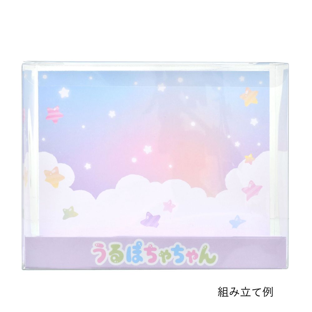 雲や星が描かれたグラデーションカラーの台紙は「うるぽちゃちゃん」のロゴ入り。