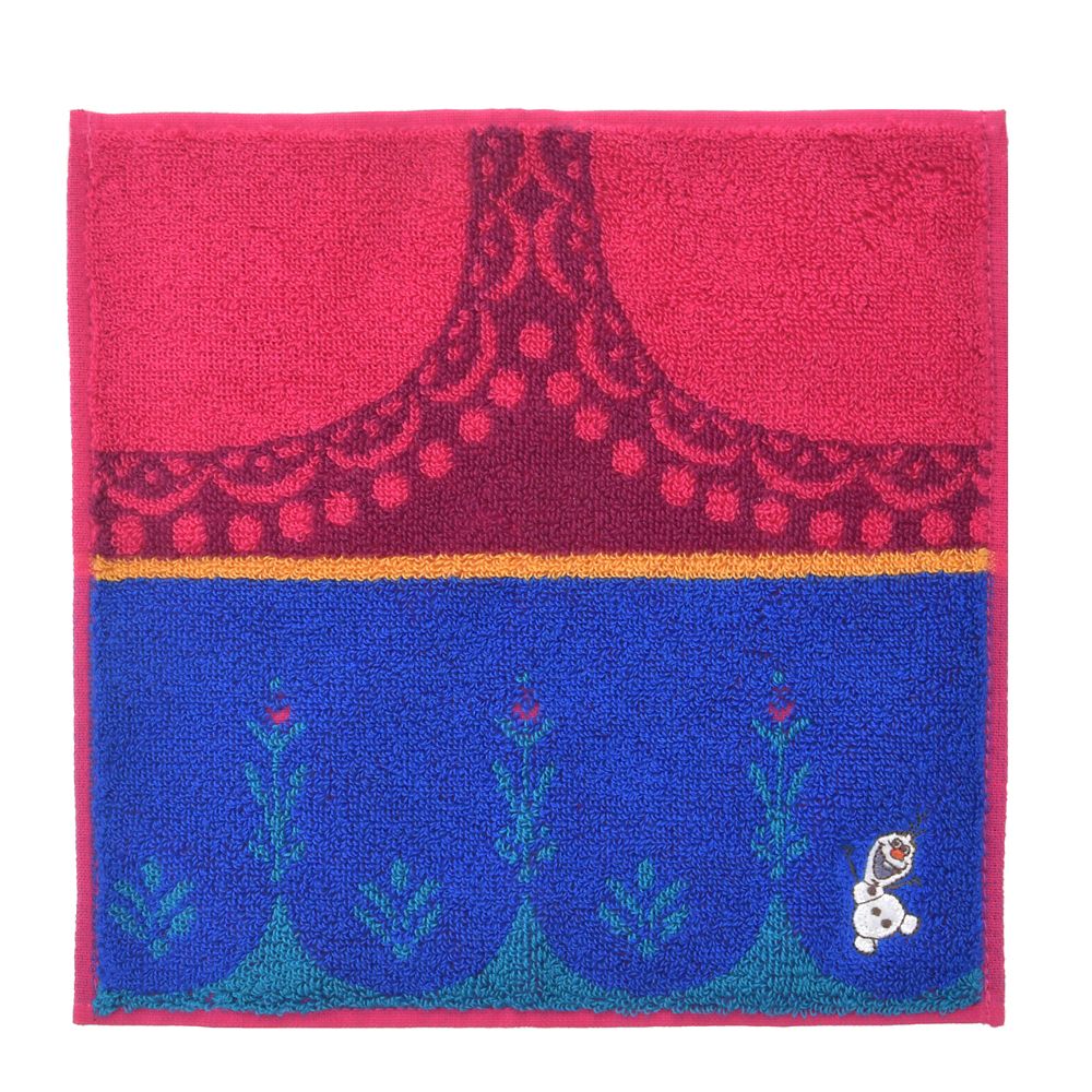 アナが着ているドレスをアレンジした、カラフルでおしゃれなミニタオル。オラフのアップリケ刺しゅうが可愛らしいアクセントです。