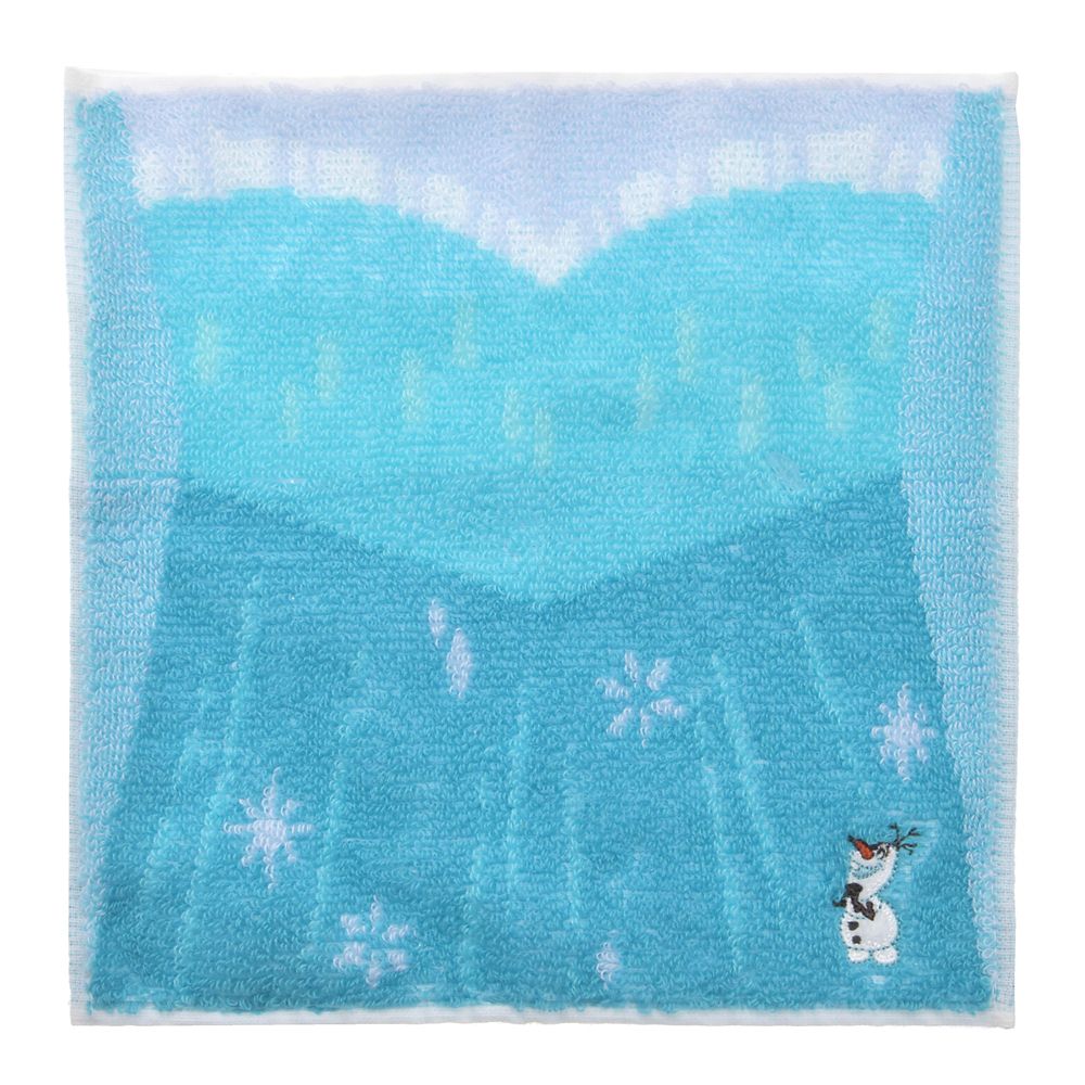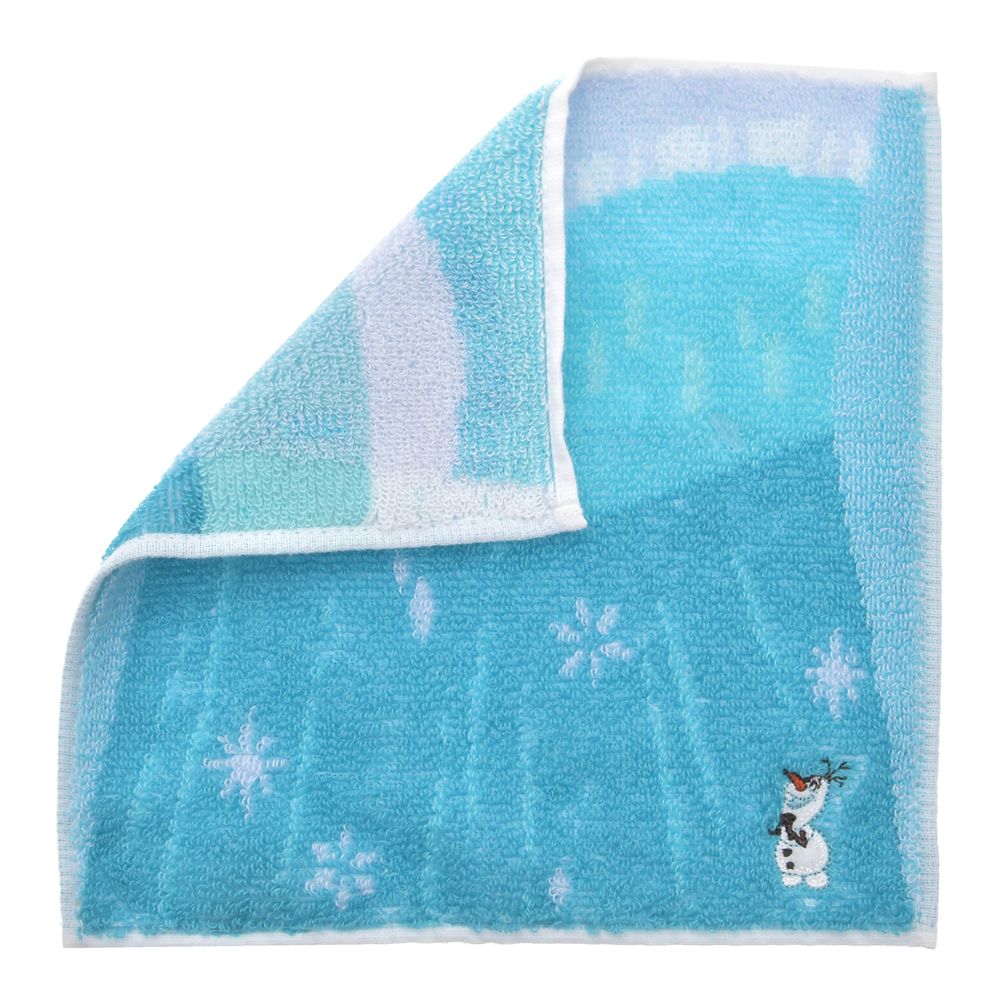 エルサが着ているドレスをアレンジした、エレガントなミニタオル。オラフのアップリケ刺しゅうが可愛らしいアクセントです。