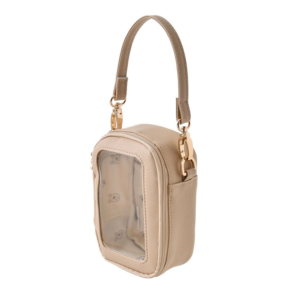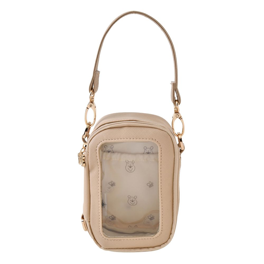 お気に入りアイテムが外から見えるクリア窓付き。プーさんをプリントした、バッグに引っ掛けて使えるストラップ付きポーチ。