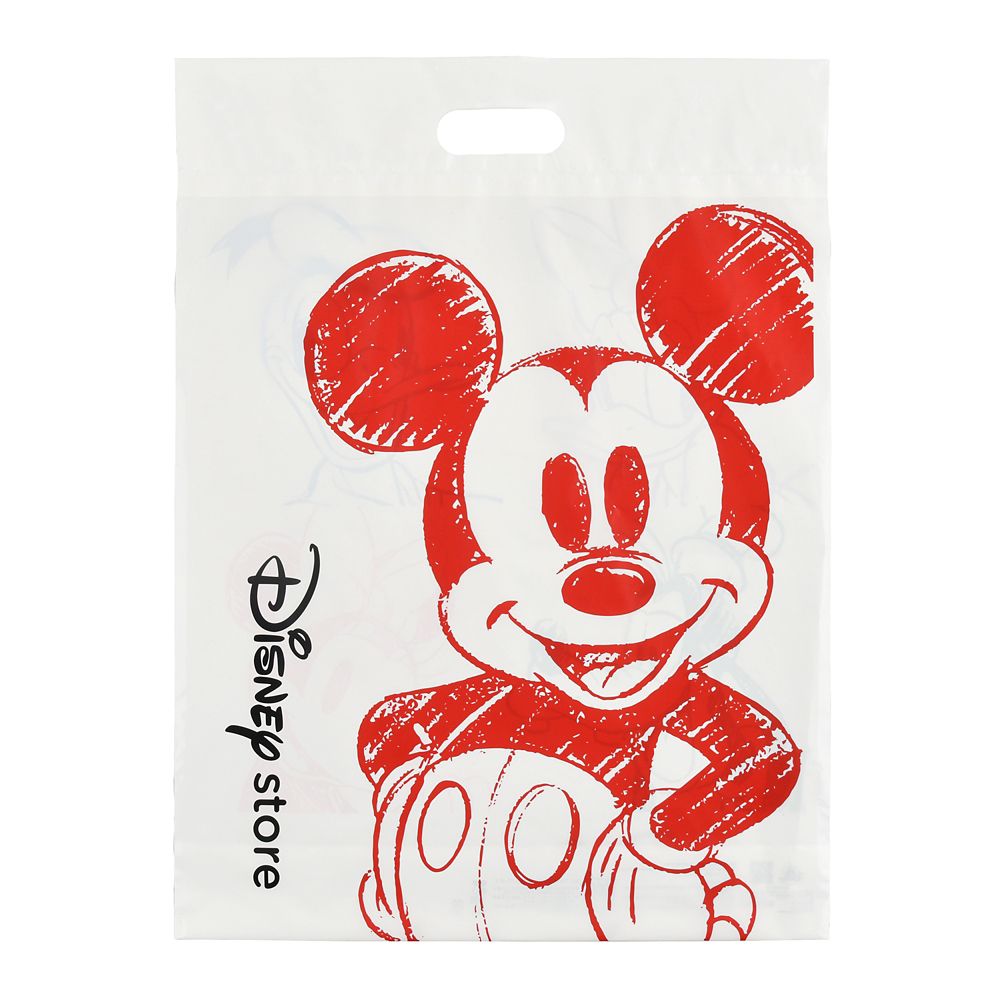 手書きスケッチ風の勢いがあるラインが特徴。片面はレッドで大きく描かれたミッキー、反面にはミニー、ドナルド、デイジー、グーフィーがそれぞれのキャラクターカラーでプリントされています。ポリエチレン製で底マチ付き。抱っこサイズのぬいぐるみや箱付きマグ、ドリンクボトルや衣類など、用途の広いサイズです。