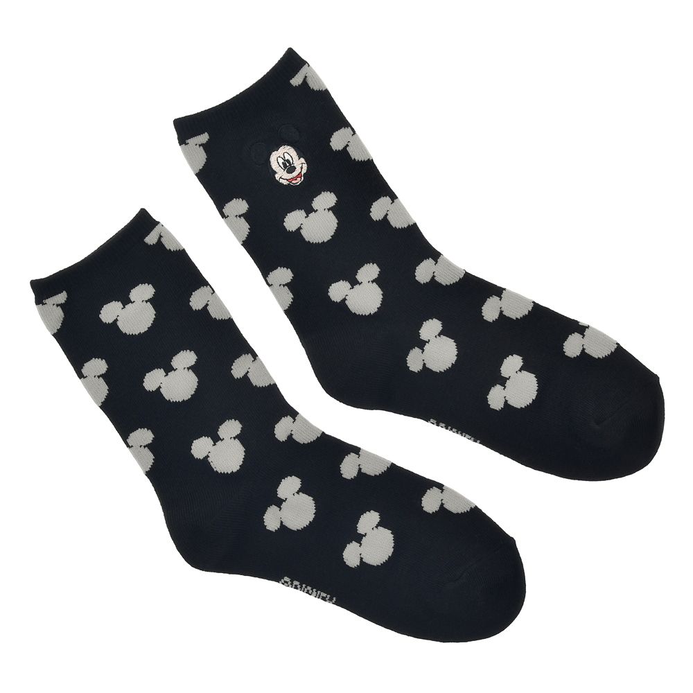 ミッキーアイコンの総柄靴下。キャラクターフェイスのワンポイント刺しゅうがアクセントです。