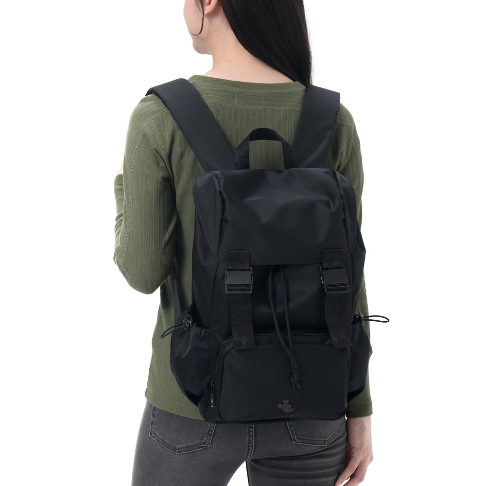 ミッキーフェイスをあしらった、ブラックカラーのフラップバックパック。