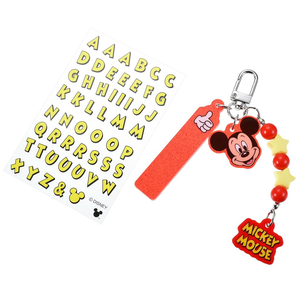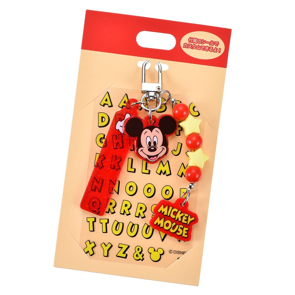 カスタマイズできるシール付き、ミッキーデザインのキーホルダー。
