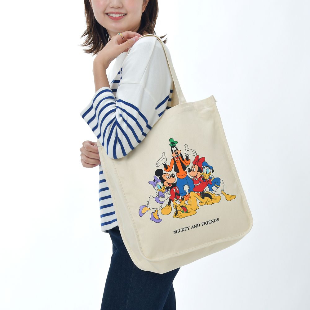 定番型のトートバッグにキャラクターイラストとロゴをプリント。ナチュラルカラーのバッグにカラフルなアートが映えます。