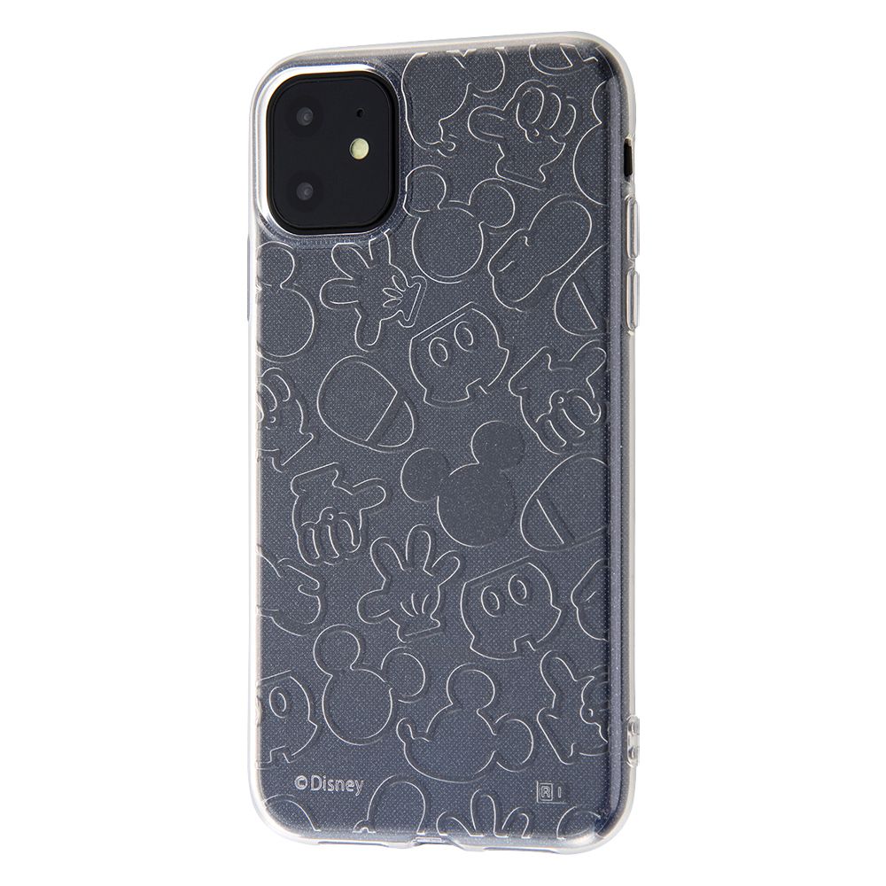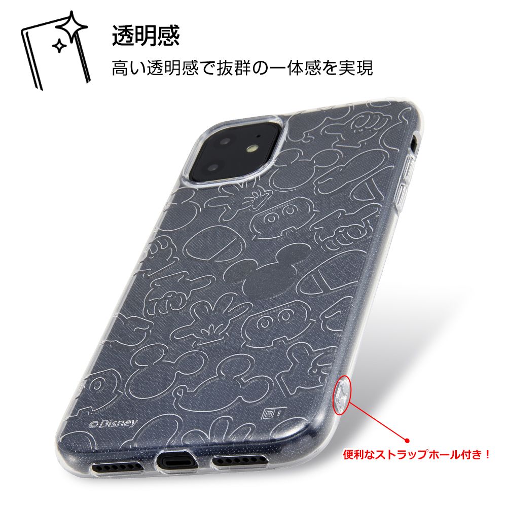 ミッキーマウスのアイコンが散りばめられた可愛いラメ入りケース。高い透明感で抜群の一体感を実現。衝撃をやわらげる柔らか素材。マイクロドット加工で背面の粘着痕を軽減。見た目を損ねない側面のストラップホール。