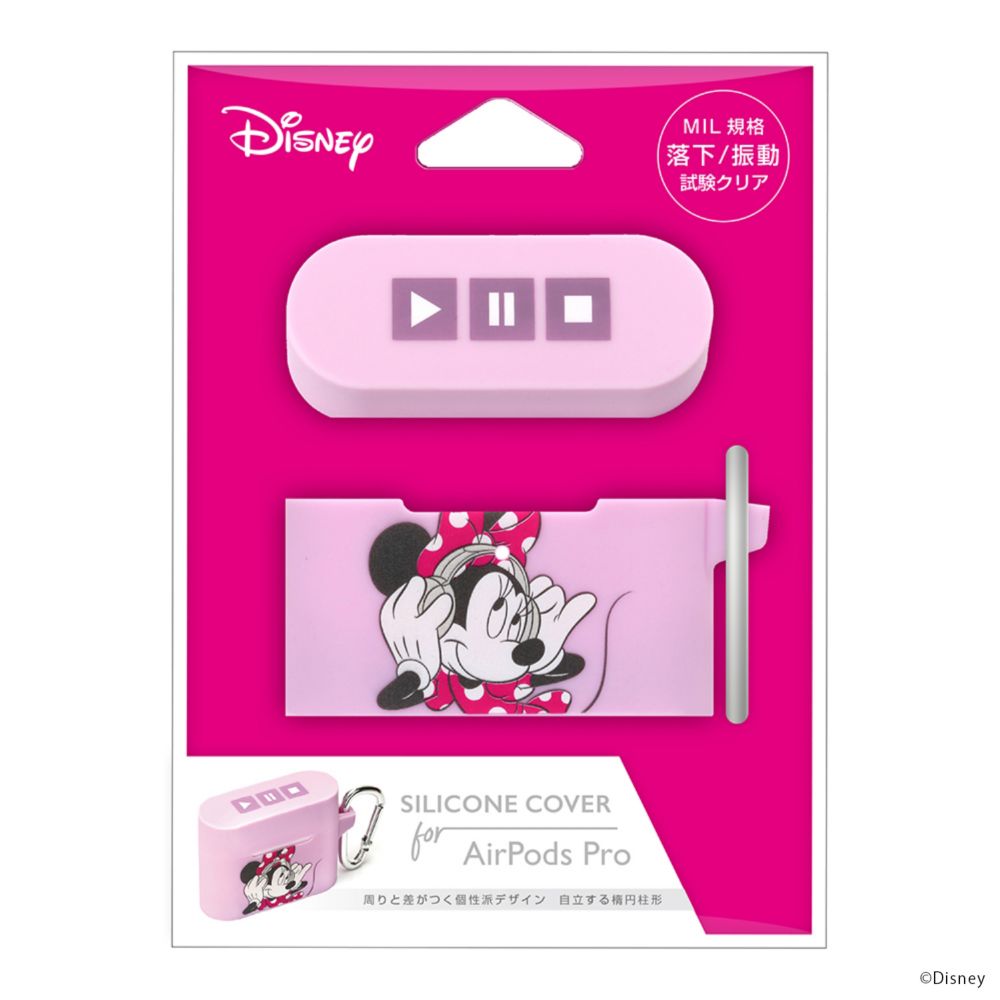 「PG-DAPPC03MNE」は、「ミニーマウス」デザインの充電ケースと本体を落下や衝撃から守るAirPods Pro用シリコンカバーです。MIL規格(MIL-STD-810G)の2項目、落下、振動に準拠した試験をクリアした、耐衝撃&耐振動設計。柔軟なシリコン素材なので着脱も楽々。卓上でもスッキリ自立する楕円柱型デザイン。カバーを装着したままケーブルでの充電はもちろんワイヤレス充電も可能。持ち運びに便利なカラビナ付きなので通勤通学にも便利です。