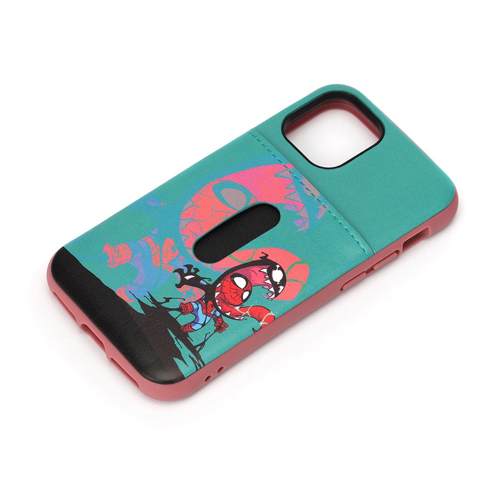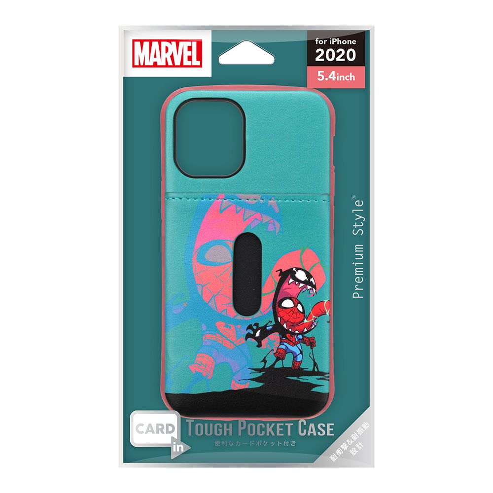 「PG-DPT20F21SPM」は、「MARVEL」キャラクターデザインのiPhone 12 mini用タフポケットケースです。MIL規格(MIL-STD-810G)の2項目、落下、振動に準拠した試験をクリアした、耐衝撃&耐振動設計。背面には通勤・通学やお買い物に便利なカードが1枚収納できるポケット付き。側面のボタンもTPU素材にてしっかり保護。ラウンド形状で手にフィットするデザイン。お手持ちのストラップを付けて落下を防止できるストラップホール付き。