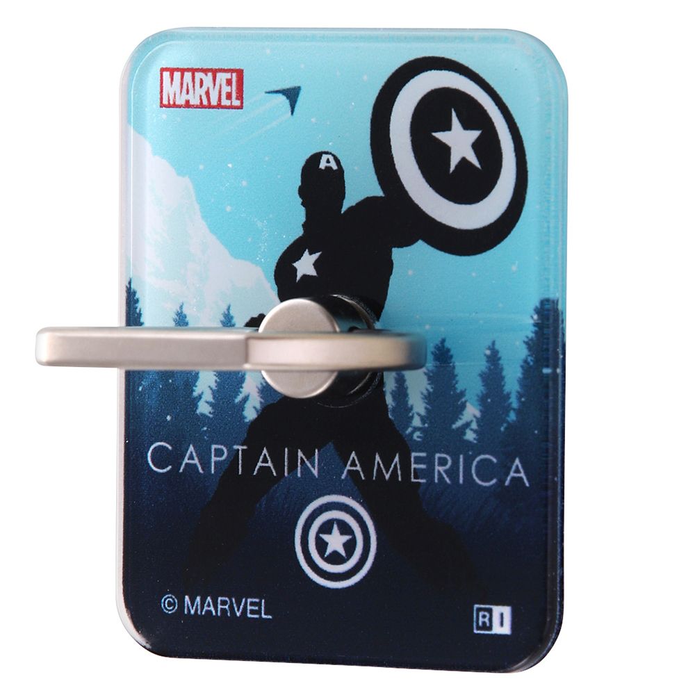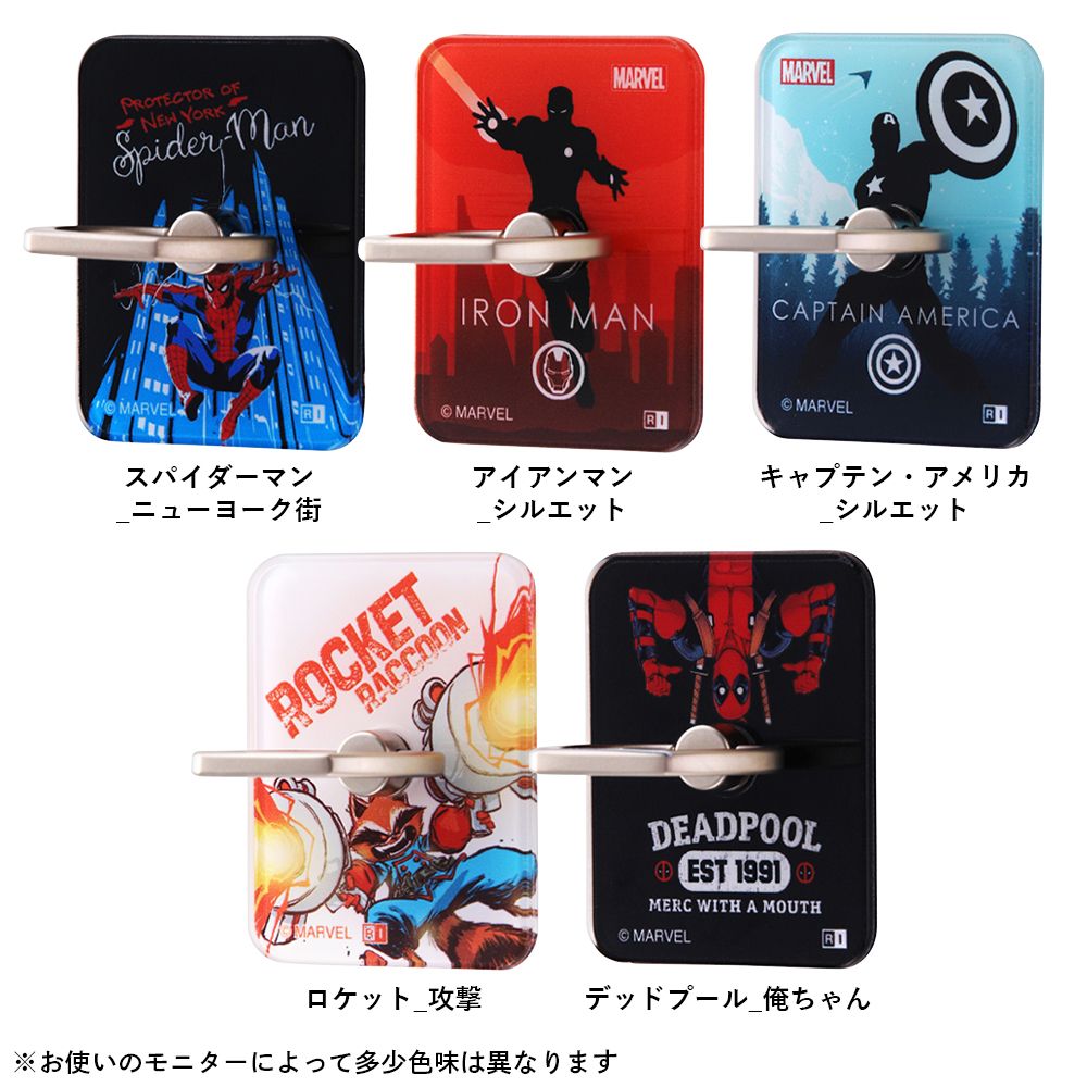 『マーベル』のデザインが施されたスマートフォン用リング。粘着強度が高いのでスマートフォンの操作中の落下を防止します。リングの角度を調整可能なので、縦でも横でも操作可能、スタンド機能としても利用できます。