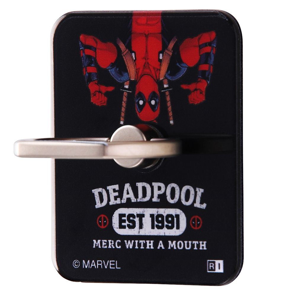 『マーベル』のデザインが施されたスマートフォン用リング。粘着強度が高いのでスマートフォンの操作中の落下を防止します。リングの角度を調整可能なので、縦でも横でも操作可能、スタンド機能としても利用できます。