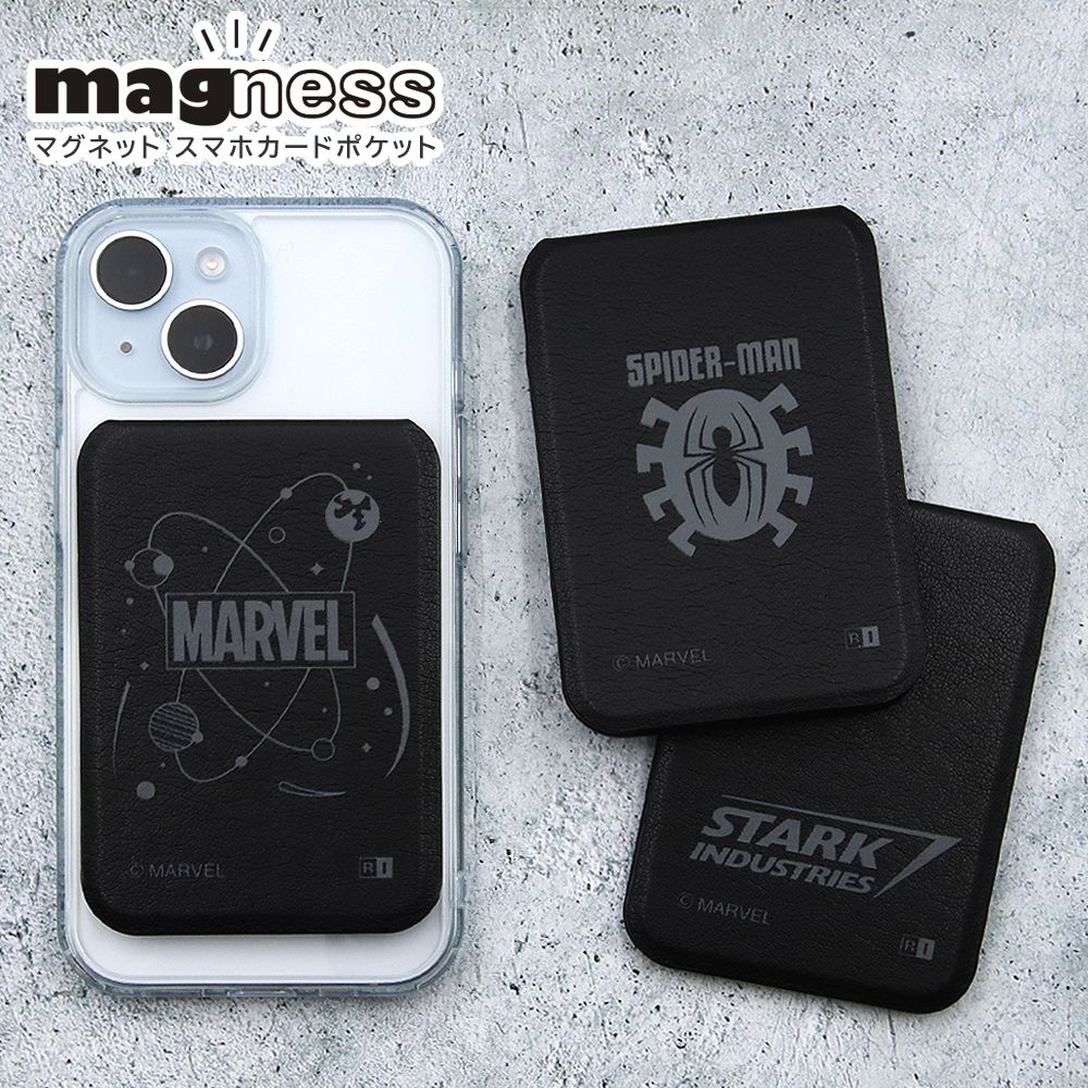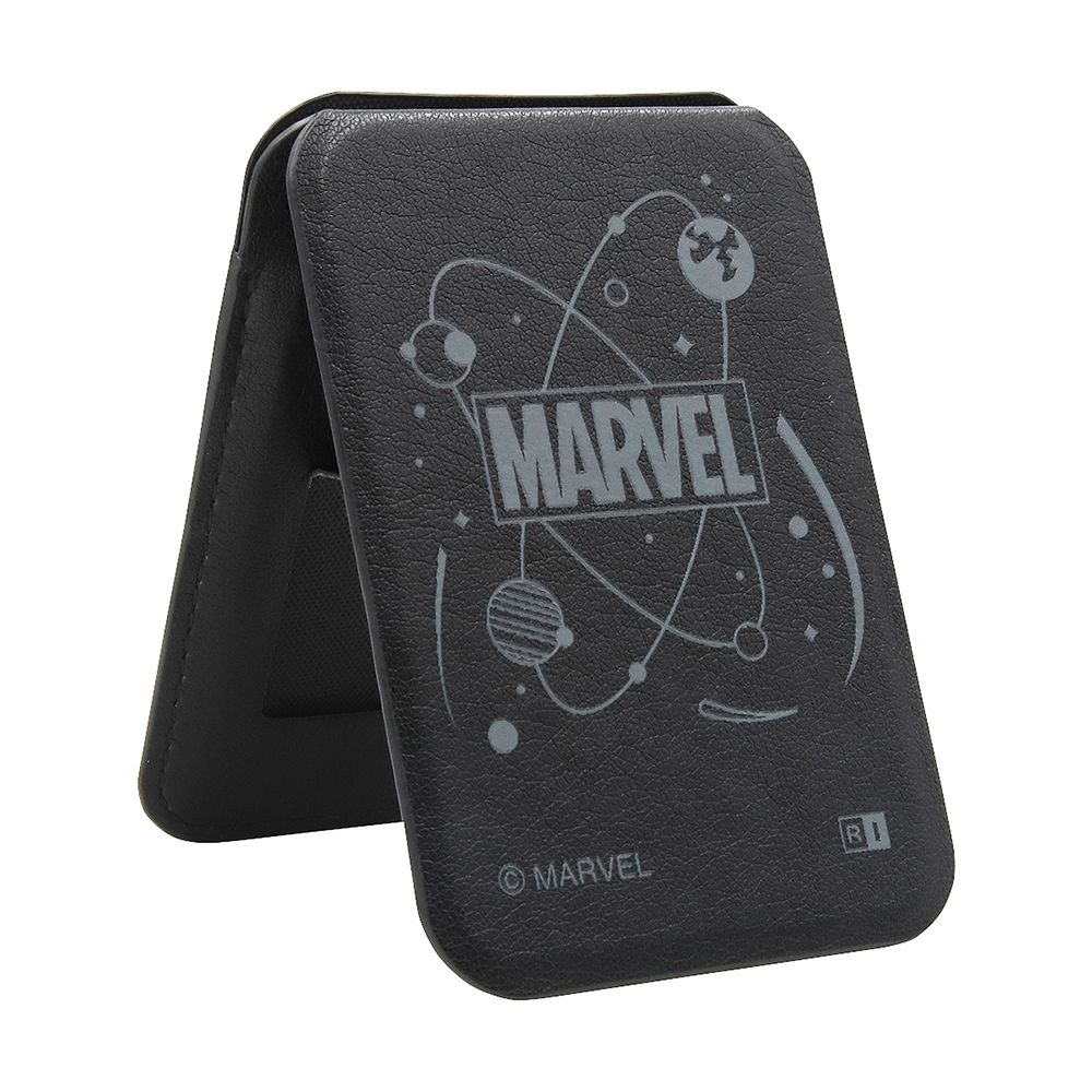 マグネットで取り外し簡単なスマホカードポケット。手にフィットして持ちやすくスタンドにもなる。スマートでカードを収納しても目立たず落としにくい。『 マーベル 』 マーベルロゴ