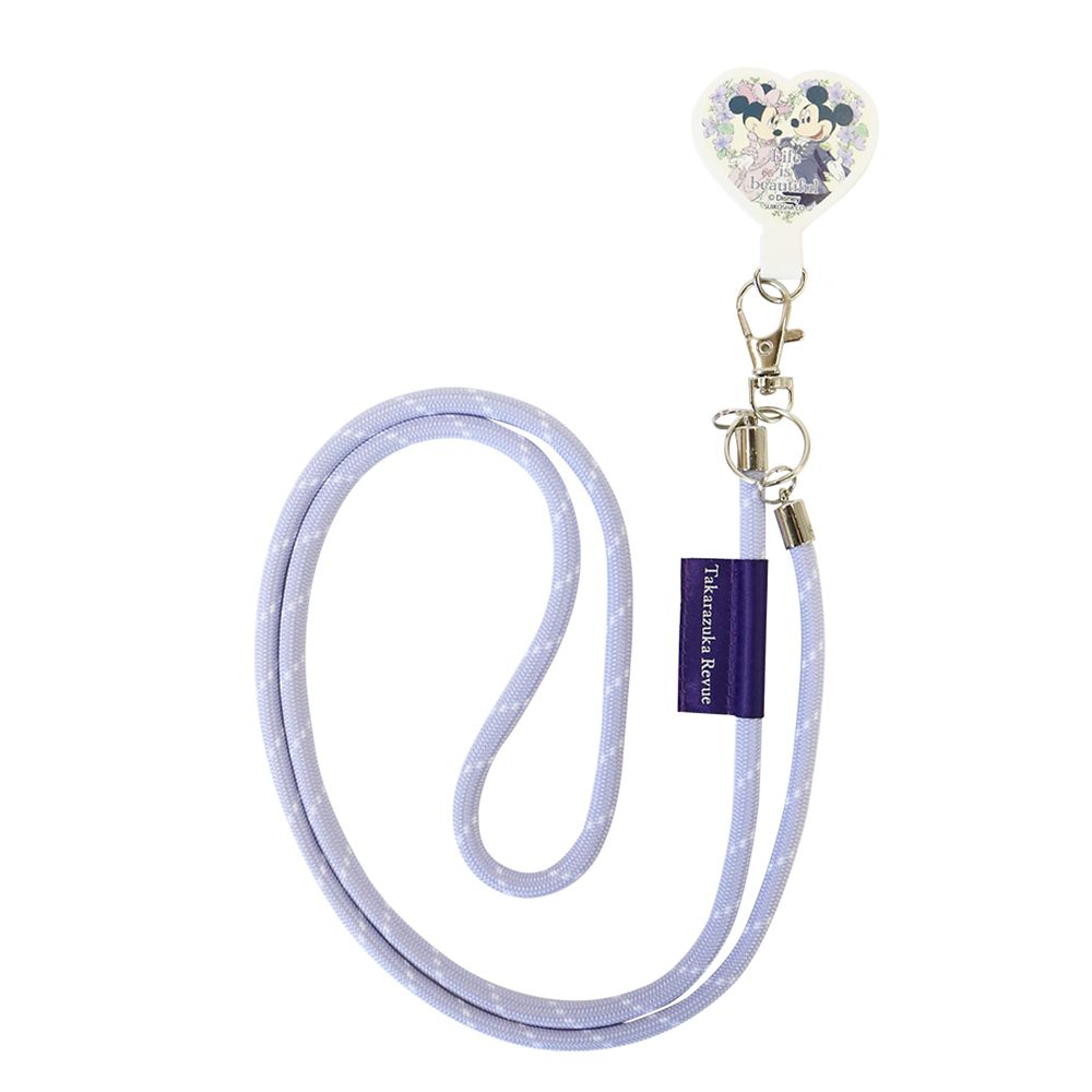 宝塚歌劇オフィシャルショップ キャトルレーヴのディズニーコレクション第二弾。今回のために描き下ろしたオリジナルアートを使用し、特別感のあるデザインを作成しました。スマホケースに挟むだけで首掛けができるフォンタブ&ストラップは、落ち着いたすみれカラーとすみれの花びらが宝塚歌劇らしい印象に仕上げています。