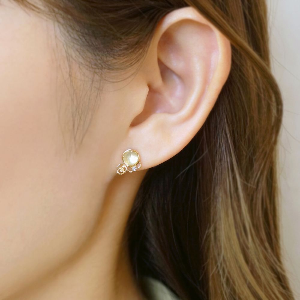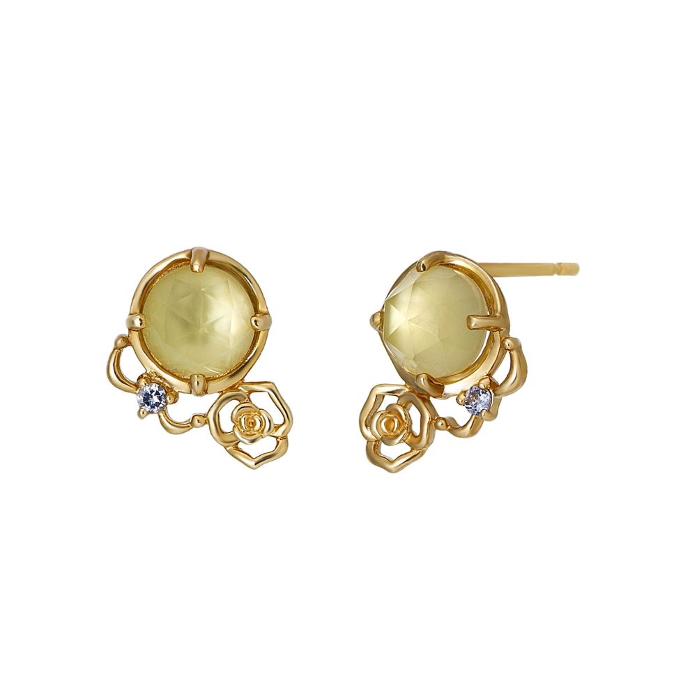 ベルをイメージしたハニークォーツはローズカットを施し、薔薇をイメージしたカットになっています。そこにホワイトシェルを重ねる事で、奥行きのある石の表情に仕上がりました。ベルと踊る野獣をイメージしたタンザナイトはアクセントで輝き、耳に沿ったベルドレスのフリルと薔薇デザインが繊細な高級感を引き立てます。