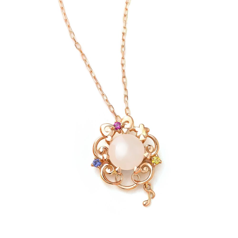 中石を囲む装飾は楽しいダンスの軌跡を表現。雪のように白く美しい肌の白雪姫をイメージしたバフトップカットのムーンストーン(6月誕生石)を、白雪姫を取り囲む7人の小人を表す7つのハートの爪でセッティングしました。シンセチックサファイアは白雪姫が想いを馳せる素敵な王子様、イエローのキュービックジルコニアは白雪姫のふんわりとしたドレスのスカートを表しています。