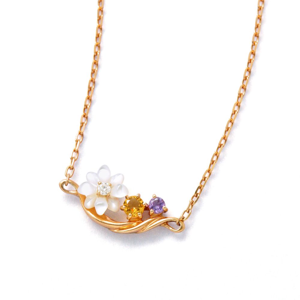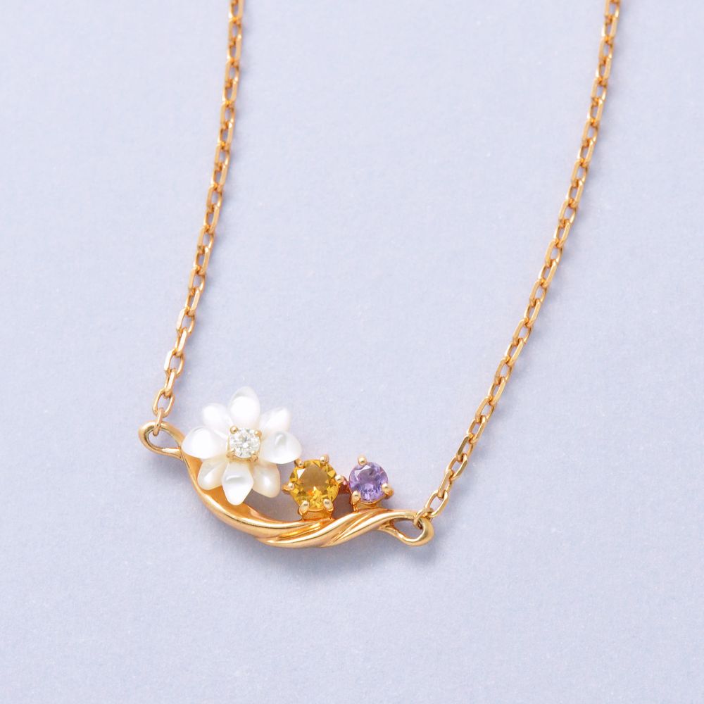 スターリングシルバー( K18ピンクゴールドコーティング)、ホワイトシェル、シトリン、ライトアメジスト、モアサナイト