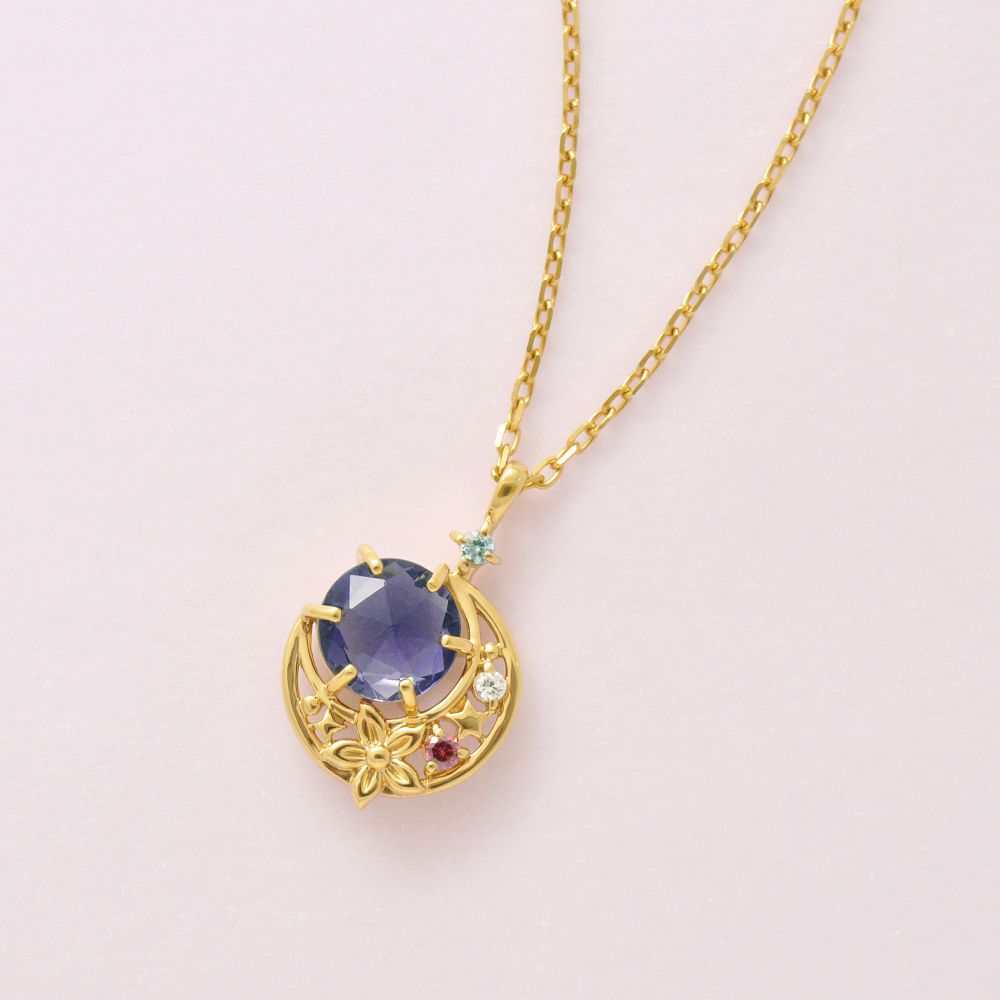 アイオライトできらめく夜空を表現。月明かりや星たちに見守られながら夜空を自由に巡る二人のデートシーンをイメージしました。月の中には輝く星やアラジンが贈った花などストーリーを感じるモチーフを散りばめ、バチカンにさり気なくセッティングした水色の石で二人を見守るランプの魔人ジーニーを表現しています。心を通わせる二人の特別な時間を閉じ込めたような、こだわりの詰まったネックレスです。