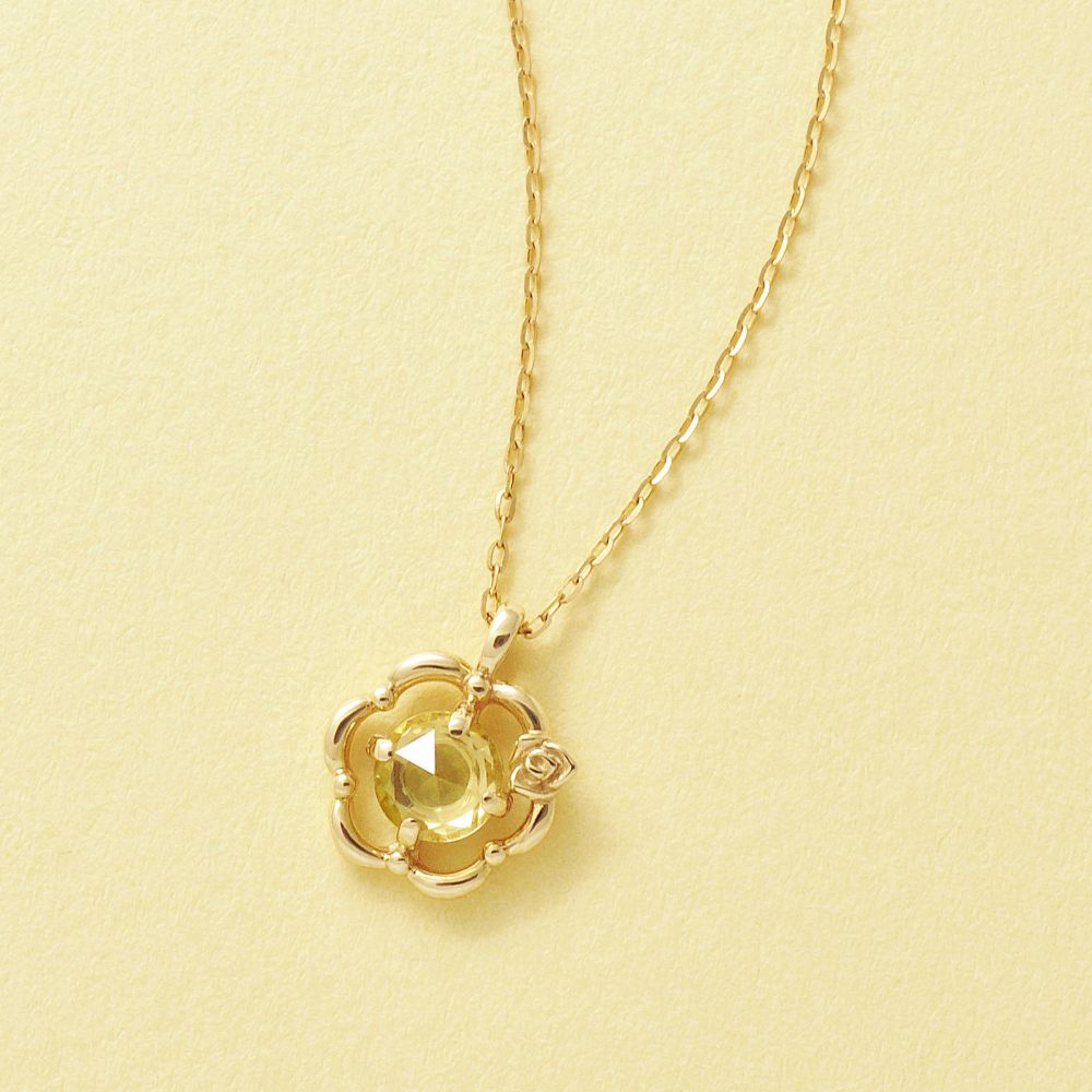 物語の中盤、2人だけの舞踏会のシーン、ベルのドレスのふわっとした形やカラーを上から見た様子をイメージしています。小さなバラがさりげなくあしらわれており、大人っぽくつけやすいデザインを目指しました。ピアスとネックレス共通のデザインですが、ネックレスの石のカットはローズカットとなっており、バラをイメージしたカットを使用しました。