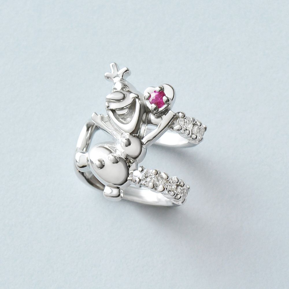 オラフで印象的な「やあみんな、僕はオラフ!ぎゅーって抱きしめて!」のシーンをイメージしたイヤーカフです。両手を広げた愛らしい様子を表現しました。ハートのモチーフを添えてオラフの気持ちや愛嬌たっぷりなキャラクターをイメージしています。イヤーカフのベースにキュービックジルコニアを敷き詰め、華やかに仕上げました。