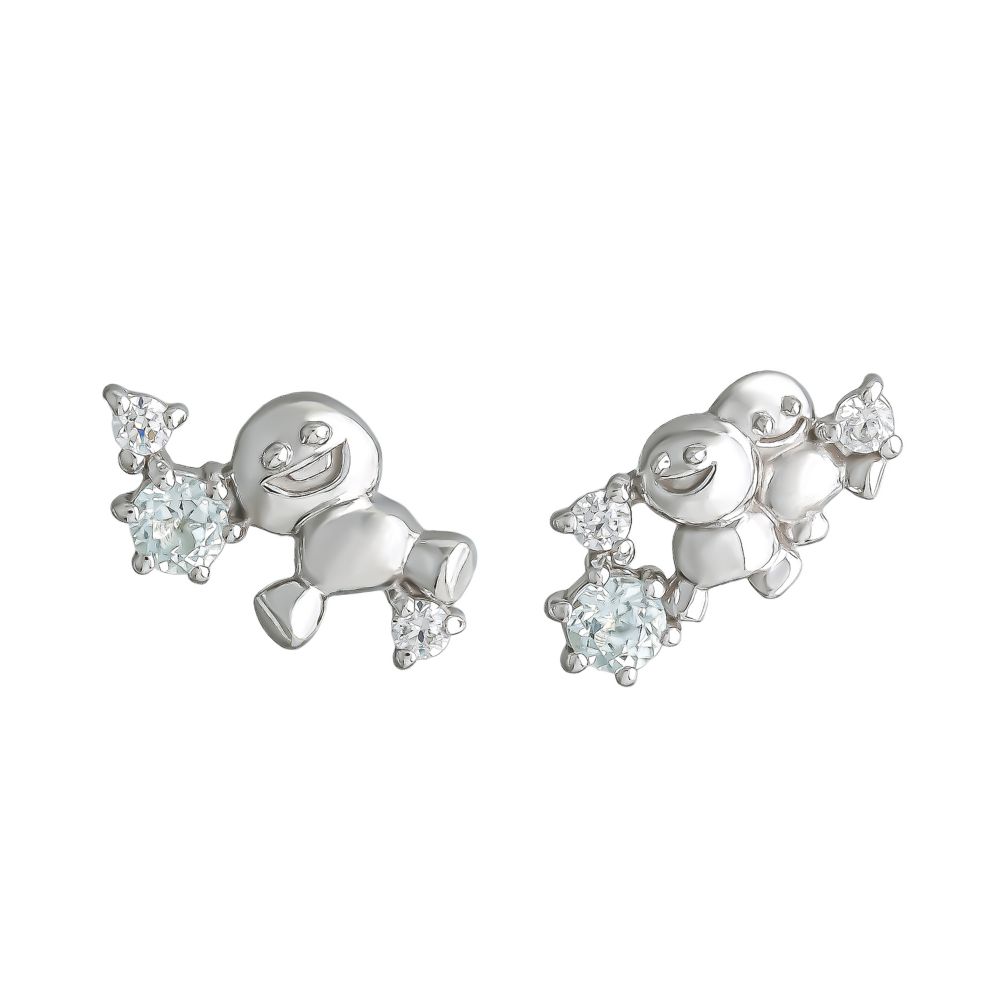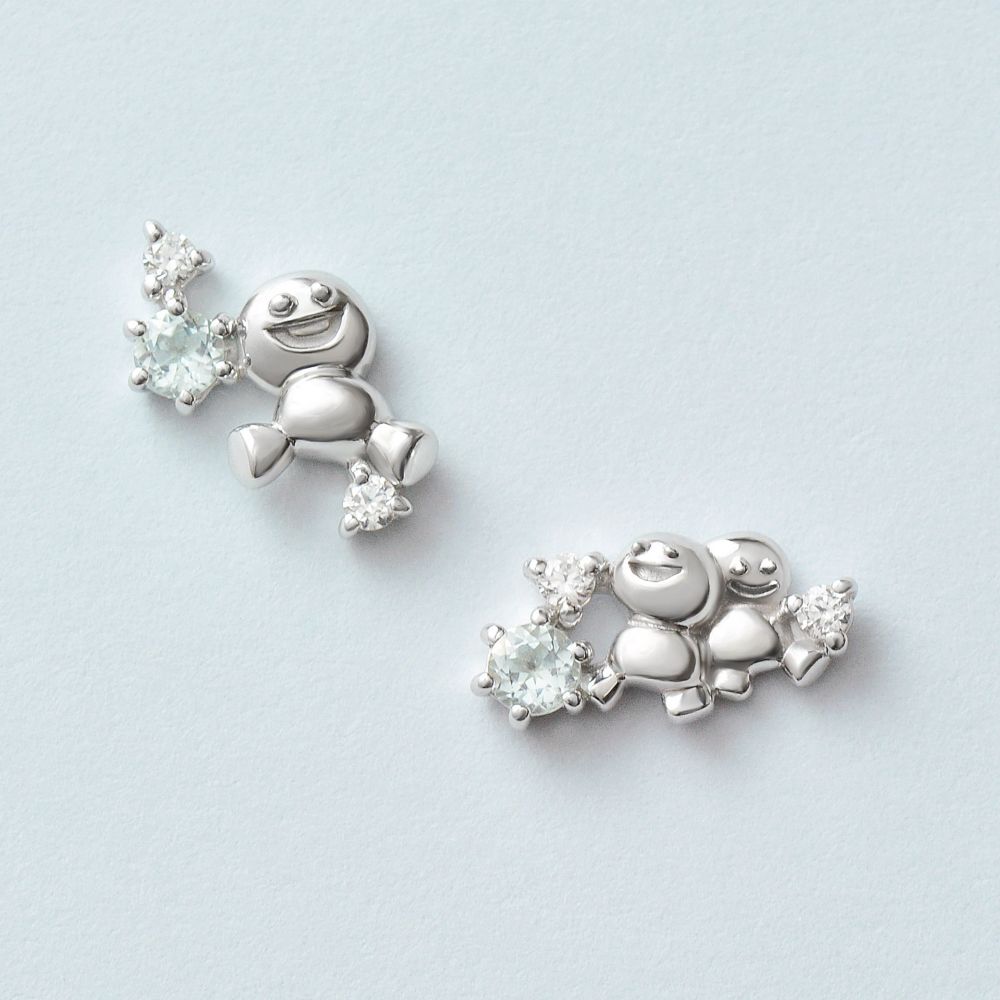 エルサがくしゃみをするたびに生まれてくるスノーギースのピアスです。沢山増えていくイメージで左右でアシンメトリーなデザインにしています。ブルートパーズとキュービックジルコニアのカラーで爽やかなスノーギース達をイメージしました。優しいカラーリングなので、コーディネートに合わせやすく日常使いにもおすすめです。
