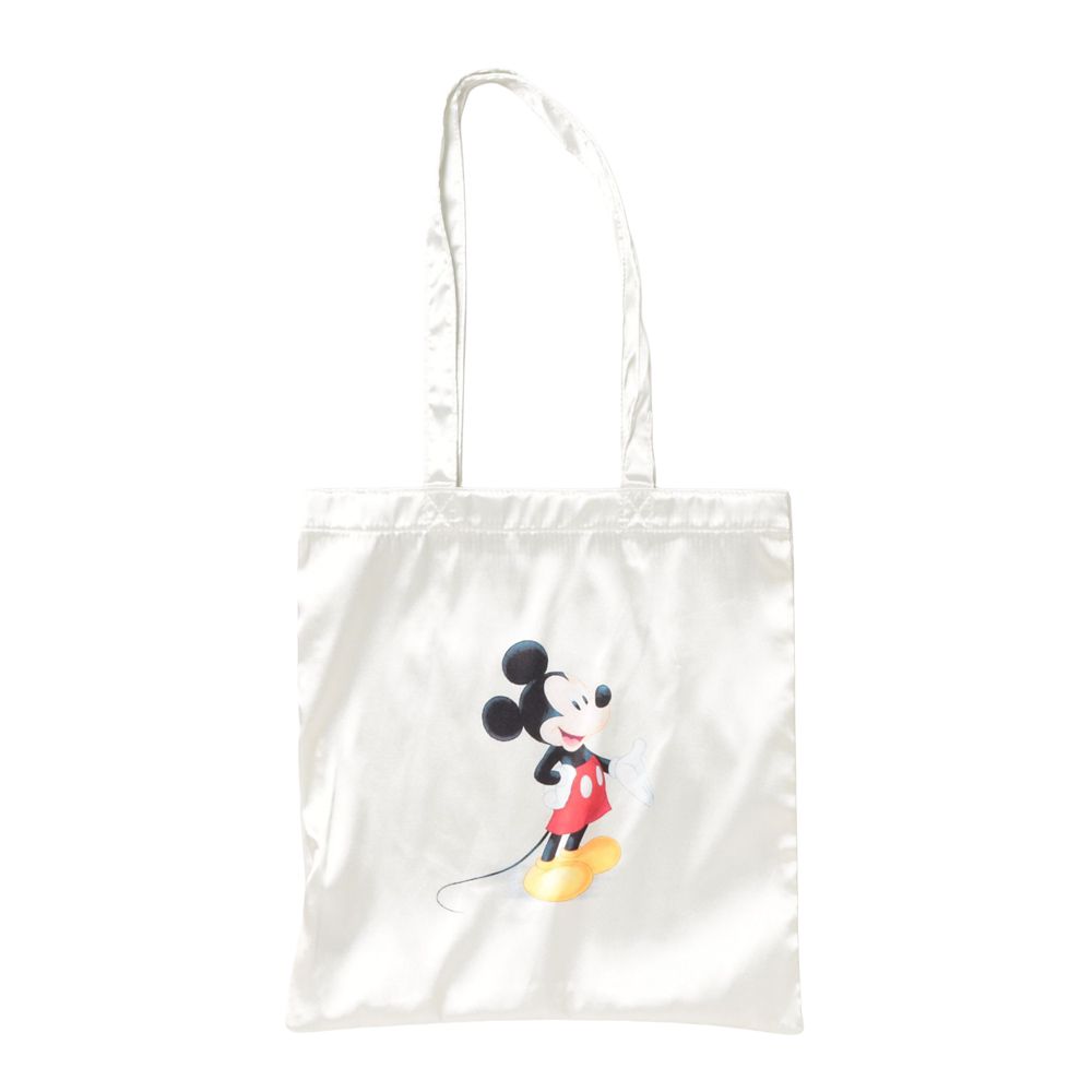 ふんわりと光沢のあるサテン生地に、人気キャラクターが華やかにプリントされたトートバッグ。