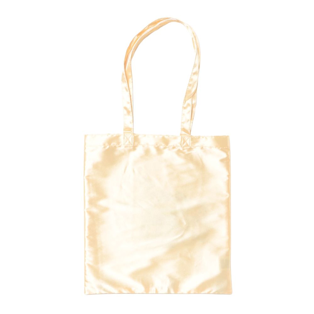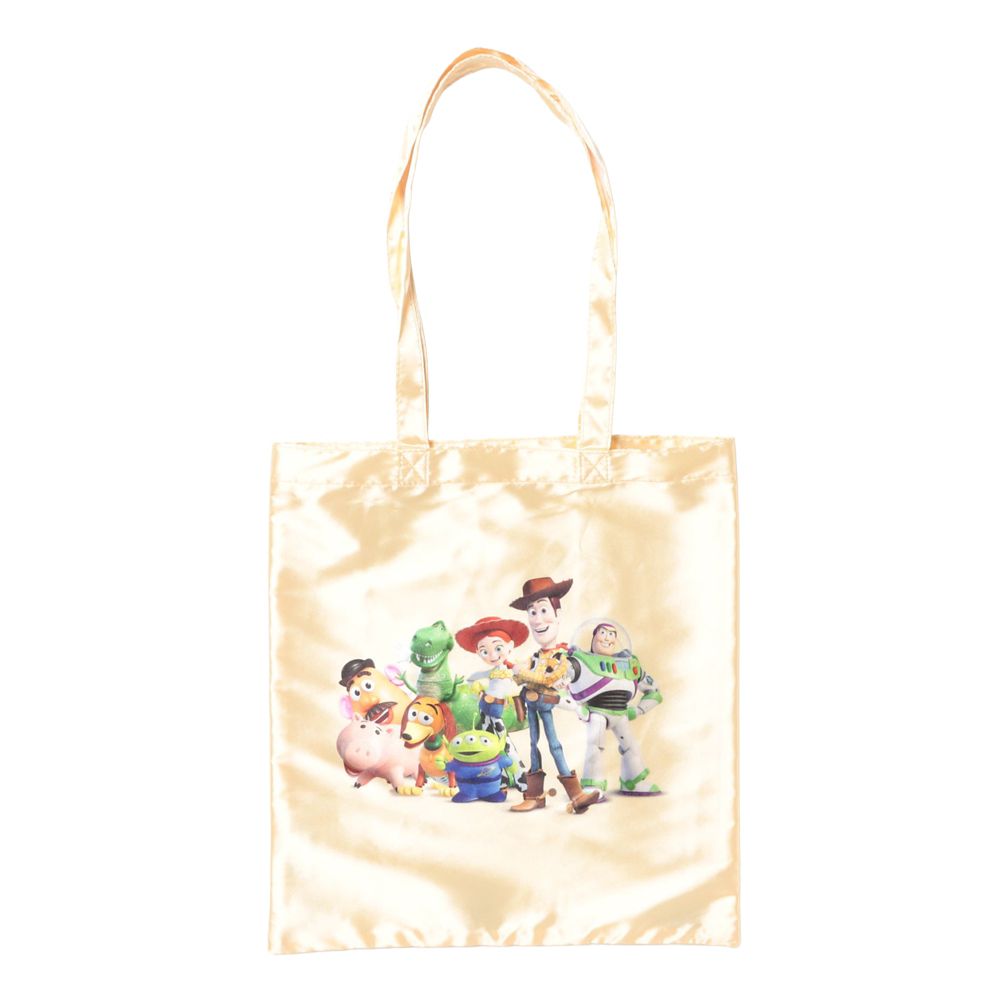 ふんわりと光沢のあるサテン生地に、人気キャラクターが華やかにプリントされたトートバッグ。