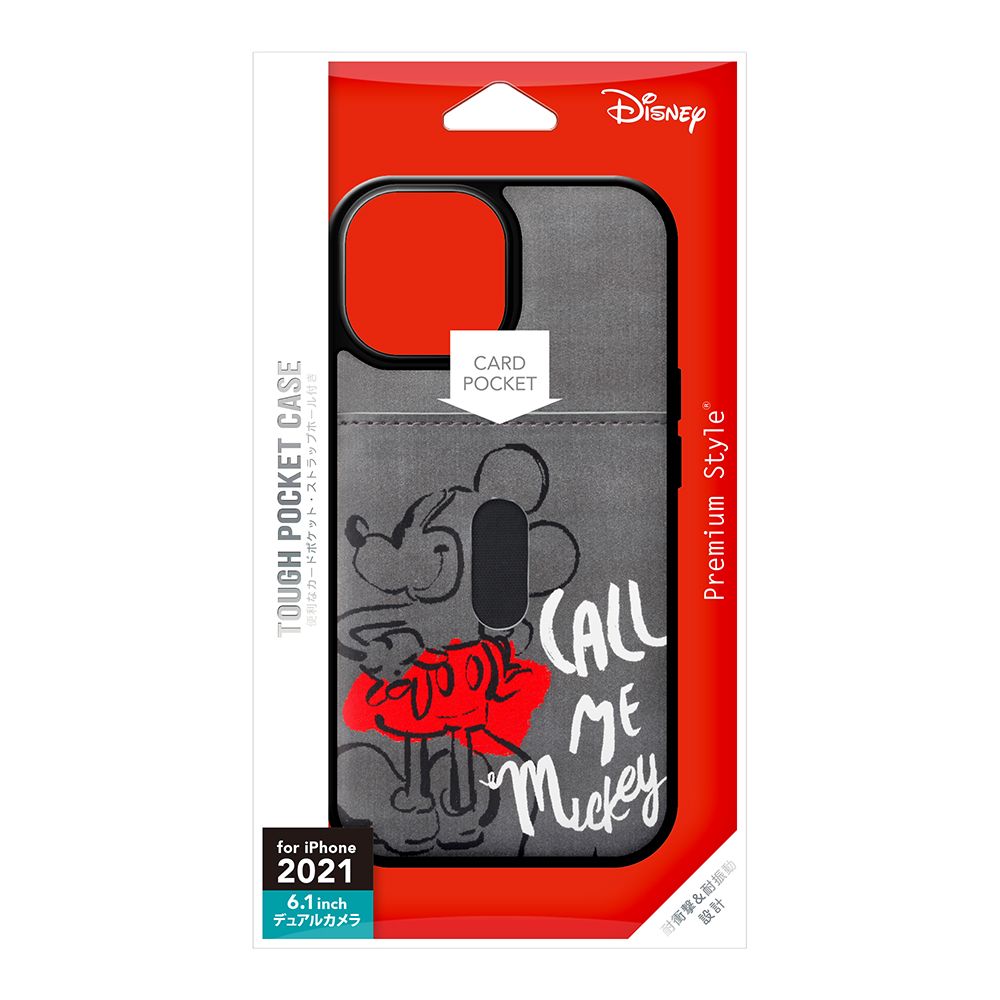 「PG-DPT21K05MKY」は、ディズニーキャラクターデザインのiPhone 13用タフポケットケースです。MIL規格(MIL-STD-810G)の2項目、落下・振動に準拠した試験をクリアした、耐衝撃&耐振動設計。背面には通勤・通学やお買い物に便利なカードが1枚収納できるポケット付き。側面のボタンもTPU素材にてしっかり保護。お手持ちのストラップを付けて落下を防止できるストラップホール付き。