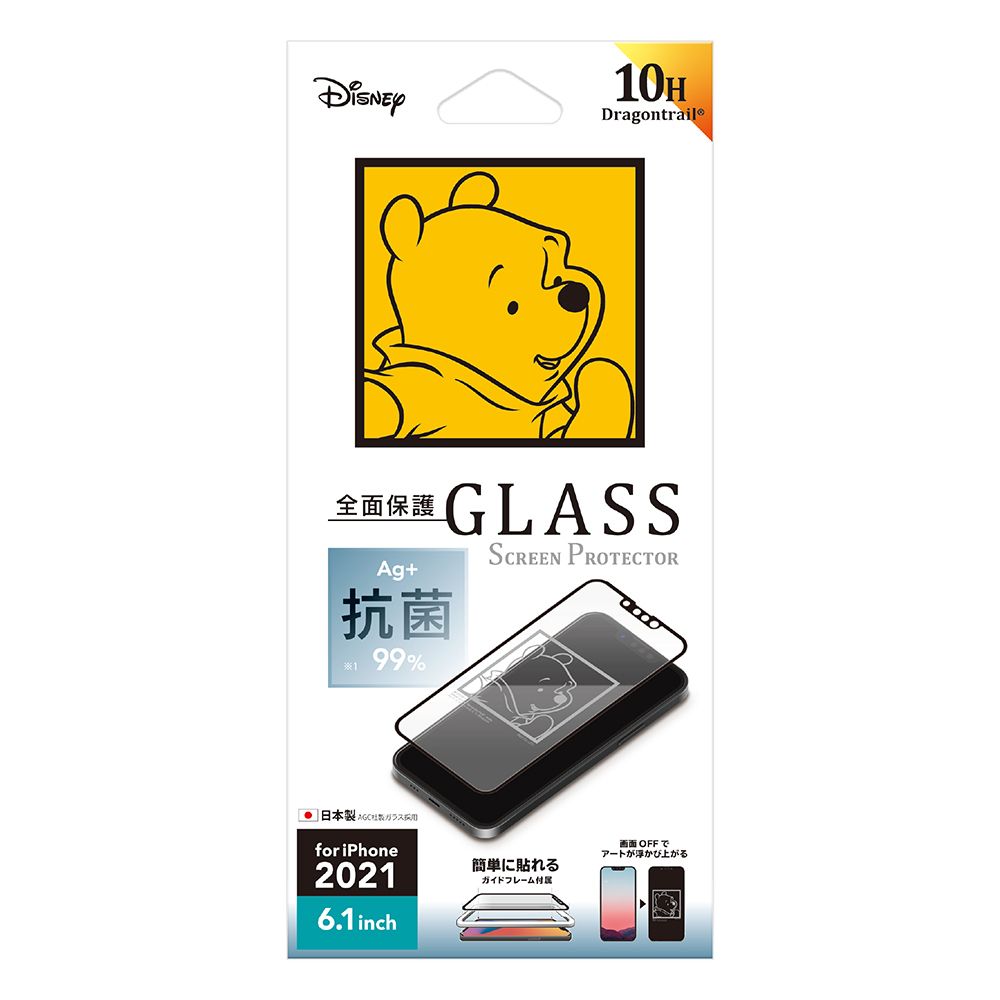 「PG-DGL21K04POO」は、端末の液晶画面をOFFにする事でディズニーキャラクターデザインが浮かび上がるiPhone 13/13 Pro用の抗菌液晶全面保護ガラスです。高光沢・光線透過率90%のガラスを採用し、美しい映像や画像をお楽しみ頂けます。銀イオンの力で細菌などの増殖を99%抑制します。また、SIAA(抗菌製品技術協議会)規格準拠商品で高い安全性も特長です。一般的なソーダライムガラスと比べ約6倍の強度を誇る「Dragontrail®」を採用し、耐衝撃性に優れています。表面硬度10Hと耐衝撃加工で液晶画面をキズや衝撃から守ります。また、従来の液晶保護ガラスにある飛散防止加工、ラウンドエッジ加工、撥水・撥油加工など快適性も考慮しました。ガラスの貼り付けに便利なガイドフレーム・ホコリ取りシール・クリーニングクロスの「貼り付けキット」が付属しています。