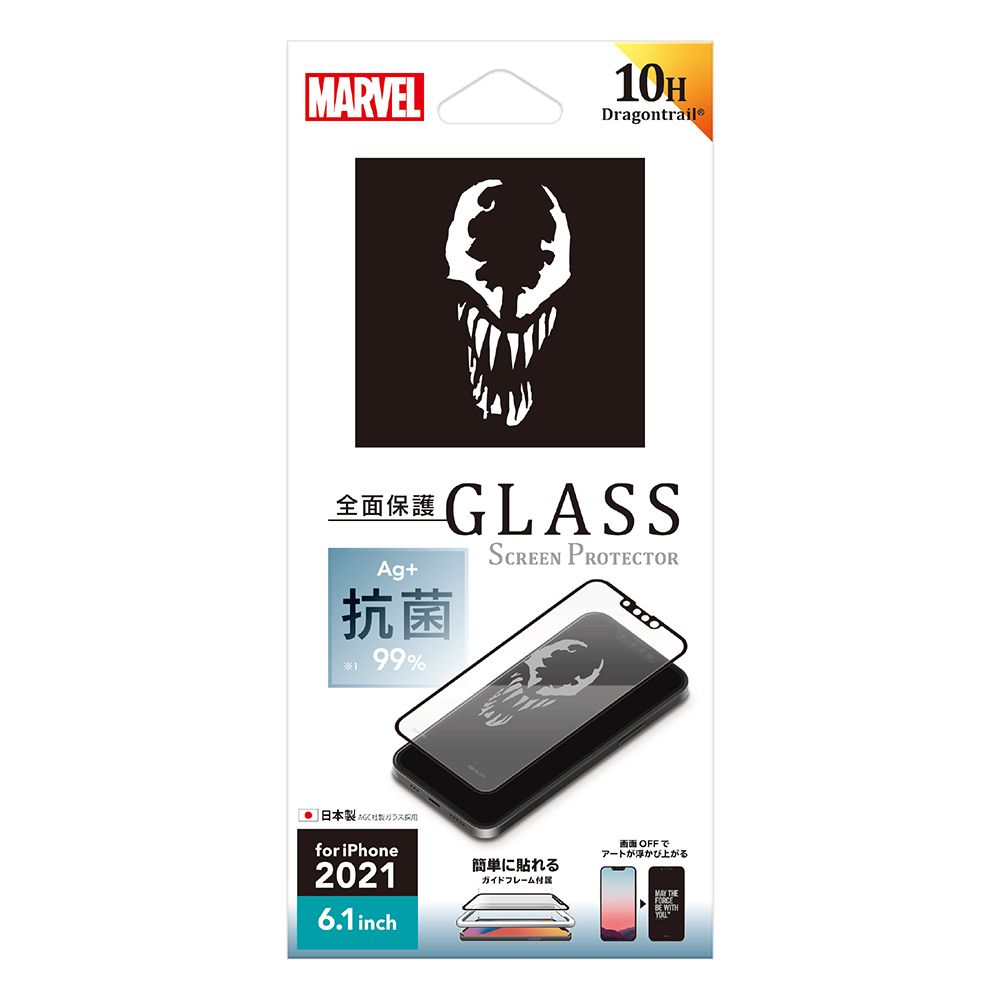 「PG-DGL21K08VEN」は、端末の液晶画面をOFFにする事で「MARVEL」キャラクターデザインが浮かび上がるiPhone 13/13 Pro用の抗菌液晶全面保護ガラスです。高光沢・光線透過率90%のガラスを採用し、美しい映像や画像をお楽しみ頂けます。銀イオンの力で細菌などの増殖を99%抑制します。また、SIAA(抗菌製品技術協議会)規格準拠商品で高い安全性も特長です。一般的なソーダライムガラスと比べ約6倍の強度を誇る「Dragontrail®」を採用し、耐衝撃性に優れています。表面硬度10Hと耐衝撃加工で液晶画面をキズや衝撃から守ります。また、従来の液晶保護ガラスにある飛散防止加工、ラウンドエッジ加工、撥水・撥油加工など快適性も考慮しました。ガラスの貼り付けに便利なガイドフレーム・ホコリ取りシール・クリーニングクロスの「貼り付けキット」が付属しています。