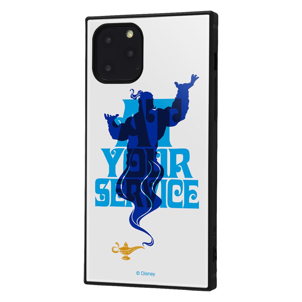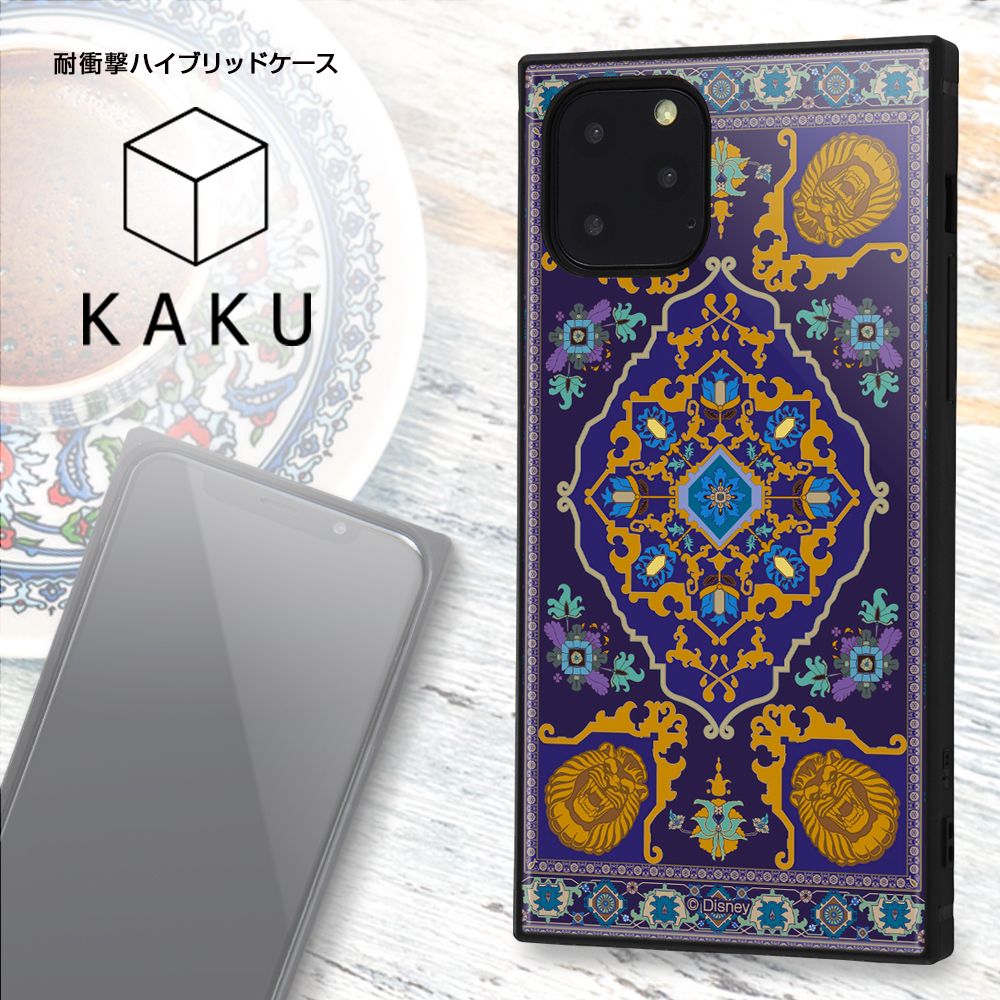 個性的な四角いフォルムと、衝撃に強いTPU素材の側面、薄くて軽く透明度の高いアクリルパネル を背面にセットした iPhone 2019年秋モデル 5.8inch用 耐衝撃ケース KAKUハイブリッド。端末側面保護、衝撃吸収エアクッション付き。背面パネルには『アラジン』のデザインがプリントされ、スマートフォンを鮮やかに彩ります。キャラクター名: ジーニー※本製品に端末本体は付属致しません