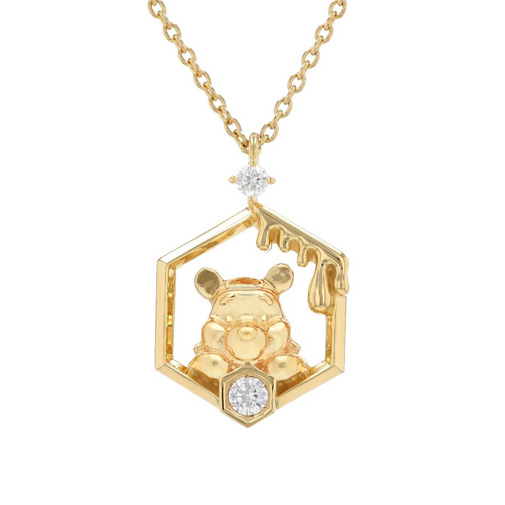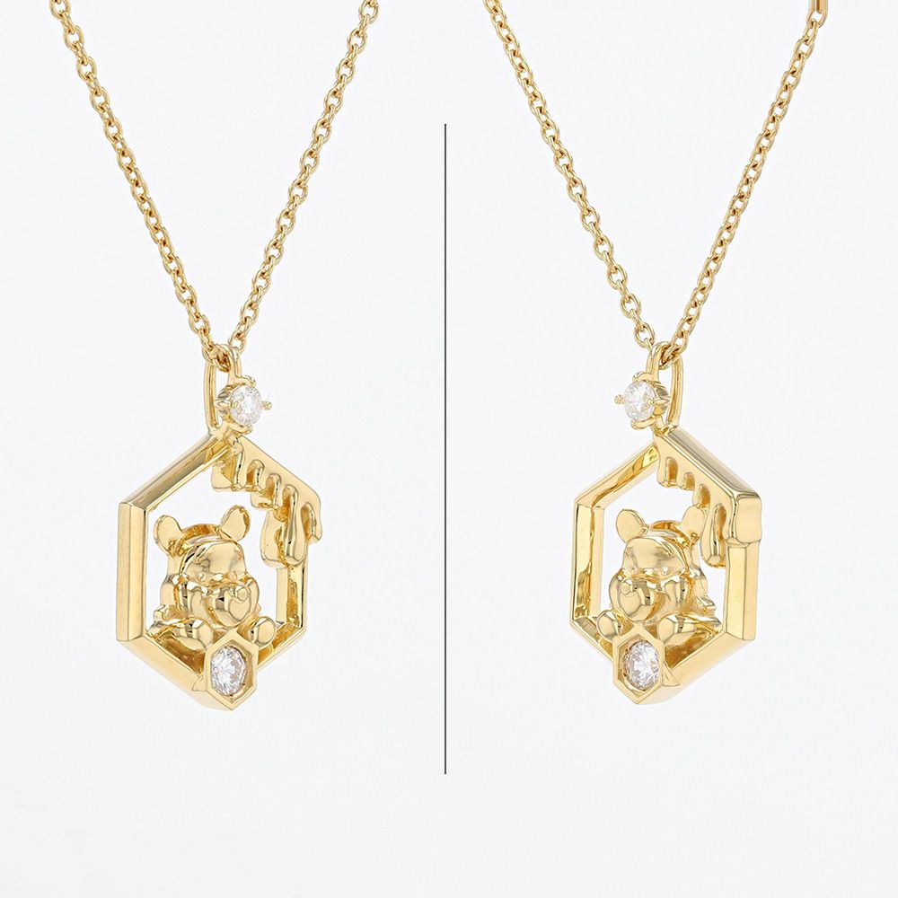 ハニカムモチーフのフレームの中からプーさんが顔を出している、愛らしいデザインが特長のペンダント。