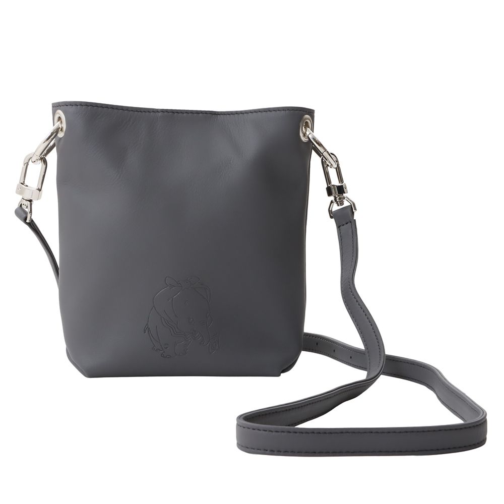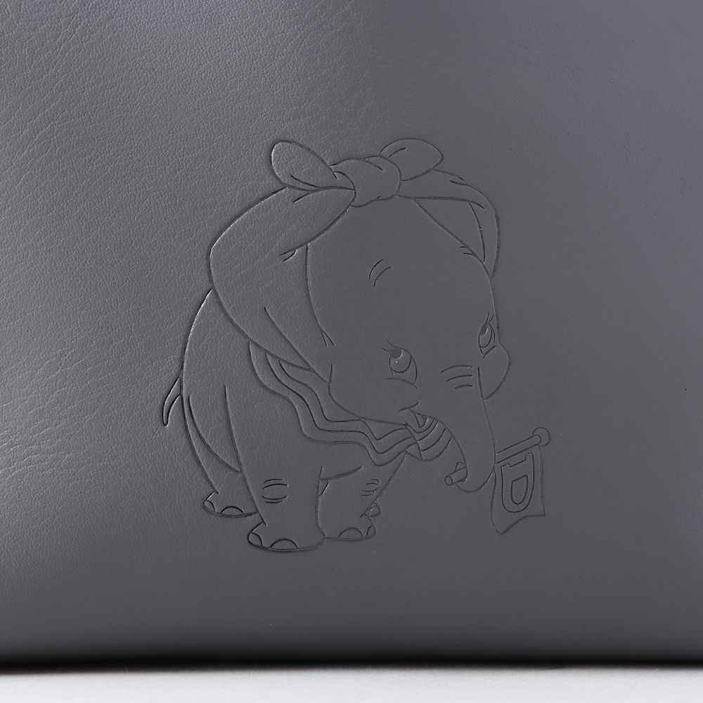 季節を問わず使いやすいマットな質感のグレーのレザーを使用。「ダンボ」の特徴である大きな耳を頭の上で結んだ姿がキュートな、ファン必見のバッグです。
