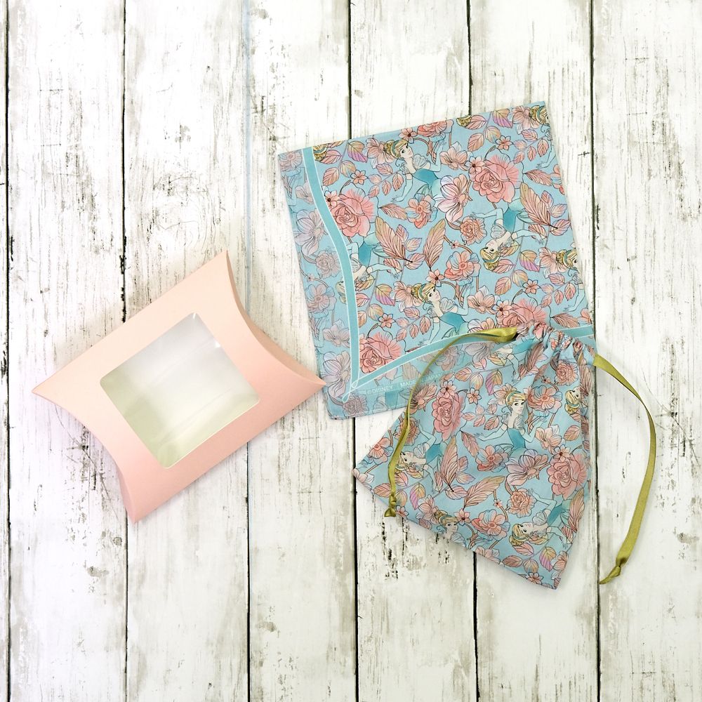 巾着はちょっとしたコスメなどの持ち運びに便利なサイズ感です。ハンカチはやわらかく心地よい肌ざわり。