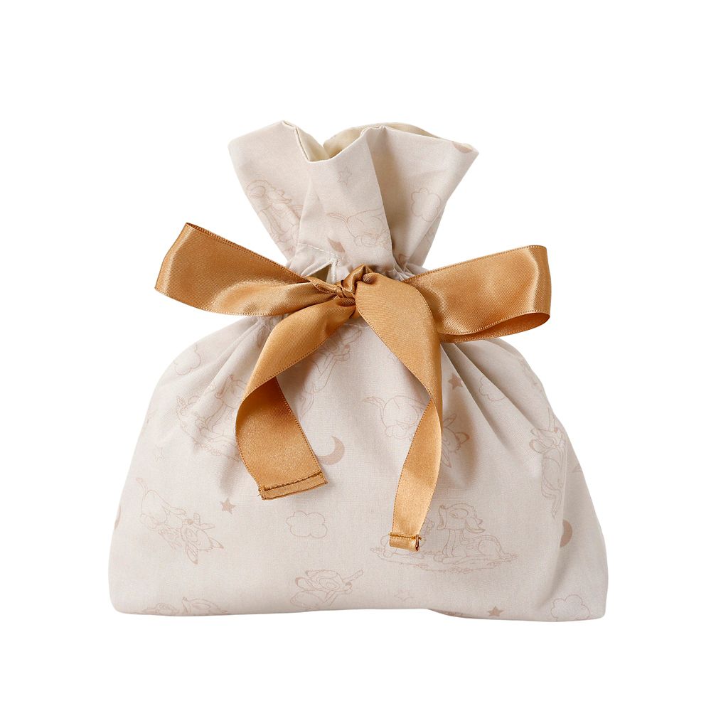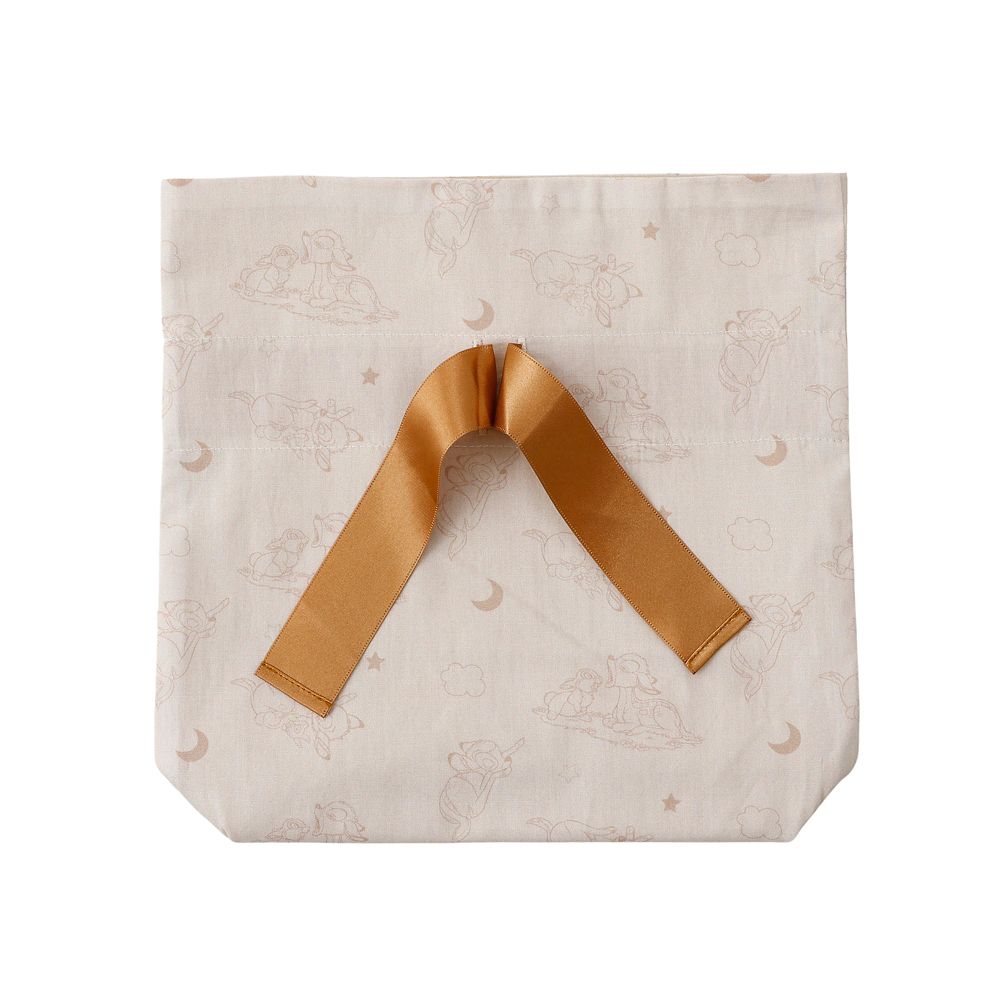 柄物のベッドシーツやブランケットを思わせる優しい色の総柄の巾着になります。様々なポーズですやすや眠るバンビのプリントがとにかくかわいいアイテムです。中には「とんすけ」の姿も。