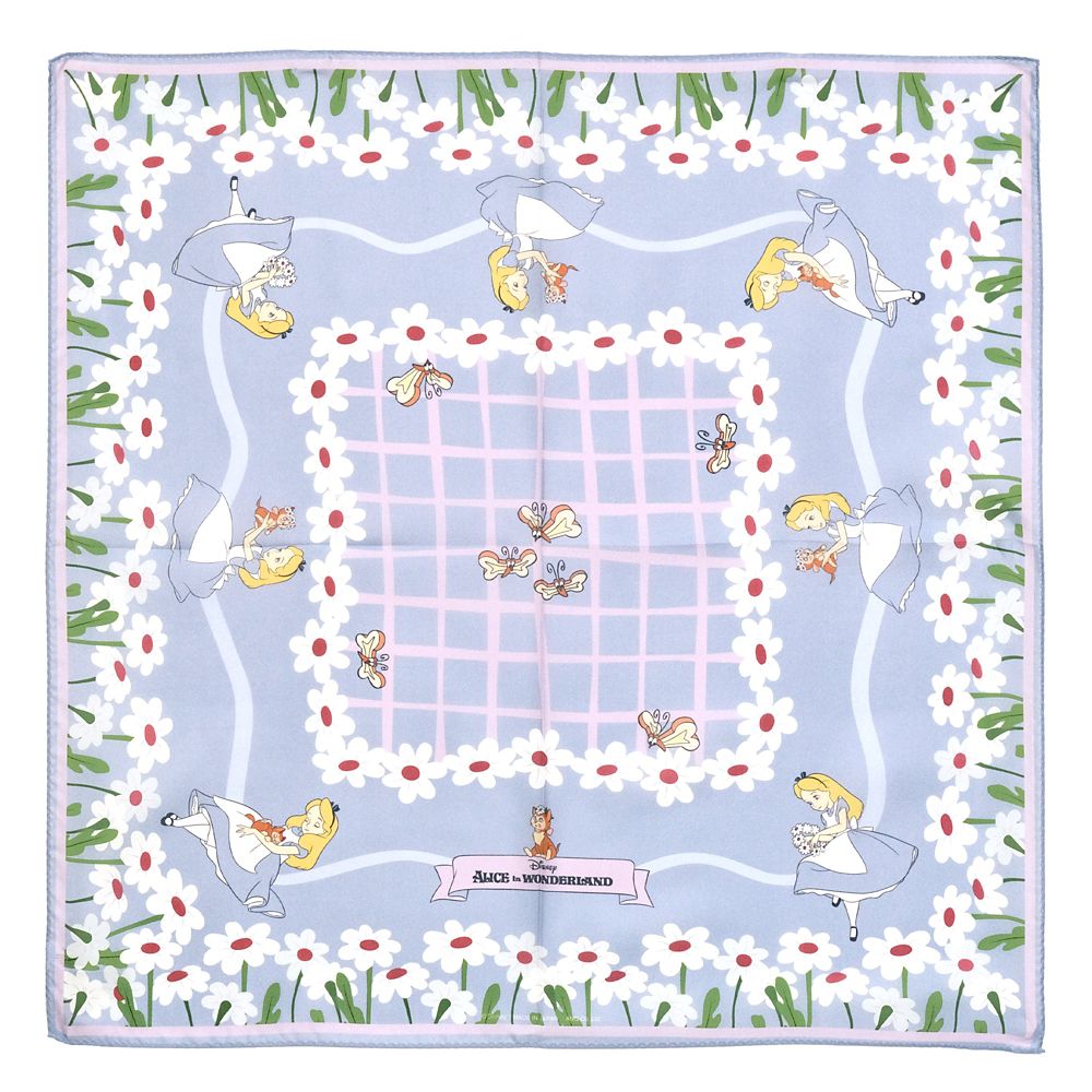 『ふしぎの国のアリス』の世界観を感じられる日本製のシルクスカーフが登場です。『ふしぎの国のアリス』の冒頭より、ひなぎくが咲き乱れる野原をイメージしたデザインとなっております。「アリス」と猫の「ダイナ」のキュートな表情も楽しめます。